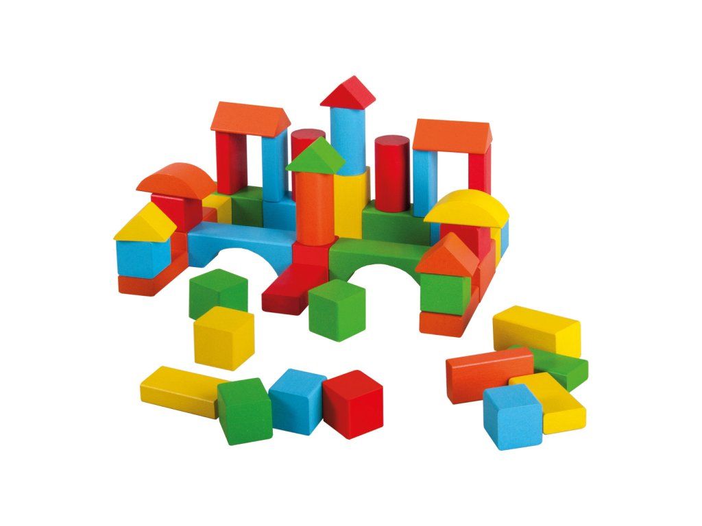 Farebná stavebnica obsahuje 50 kusov drevených kociek rôznych tvarov, ktoré deťom ponúkajú pestré možnosti stavania a tvorivej hry.
