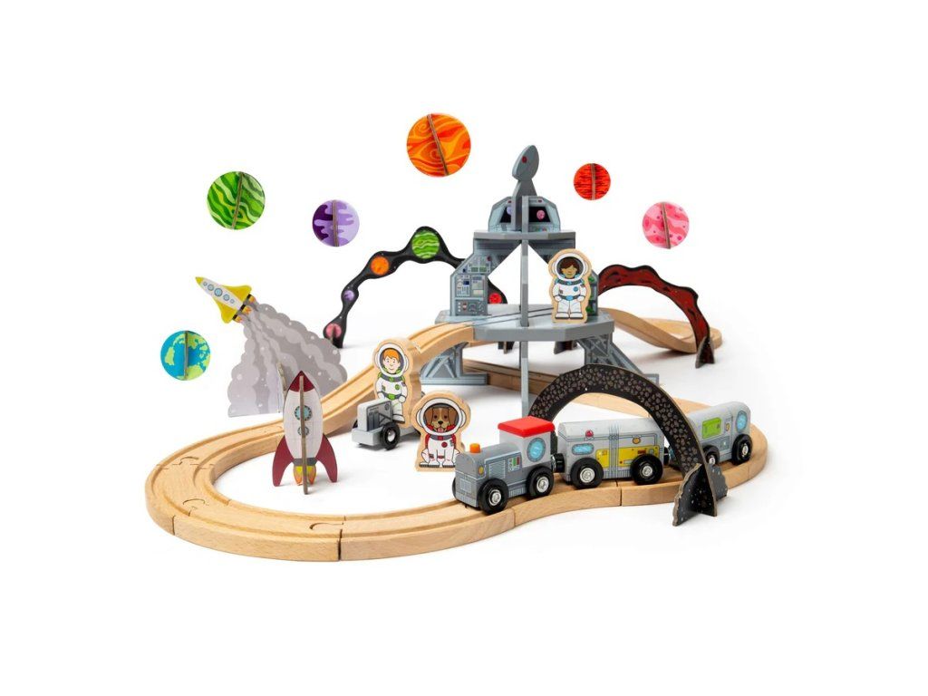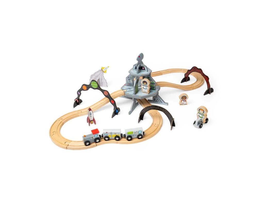 Súprava obsahuje drevenú lokomotívu so dvoma vagónikmi a množstvo doplnkov inšpirovaných vesmírom, ako sú planéty, hviezdy, astronauti alebo rakety. Súčasťou je aj viacposchodová vesmírna stanica, ktorú môžu deti počas hry zostavovať a zapojiť do svojej trate. Celkovo sada obsahuje 40 dielikov, ktoré umožňujú variabilné stavanie a opakovanú zábavu.