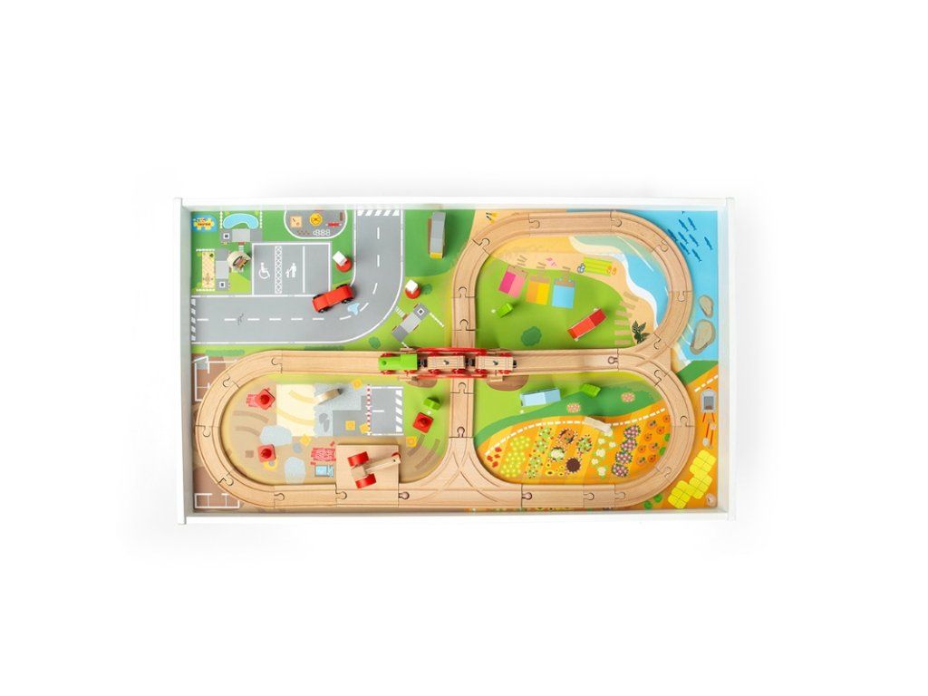 Predstavujeme vám Bigjigs Rail drevenú vláčikodráhu so stolom – vašu jednosmerný lístok do sveta nekonečných dobrodružstiev! Predstavte si, ako sa oči vášho dieťaťa rozžiaria, keď prvýkrát uvidí tento úchvatný svet plný možností, kde každý deň môže byť novým dobrodružstvom. Tento set nie je len klasickou hračkou, ale otvára dvere do sveta fantázie, kde sa mesto a dedina prepájajú príbehmi, ktoré si vaše dieťa samo vytvorí.