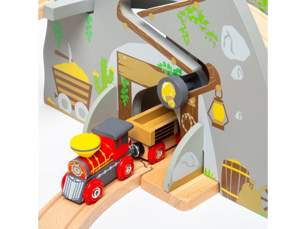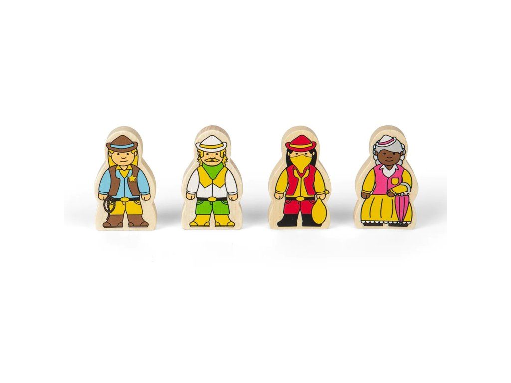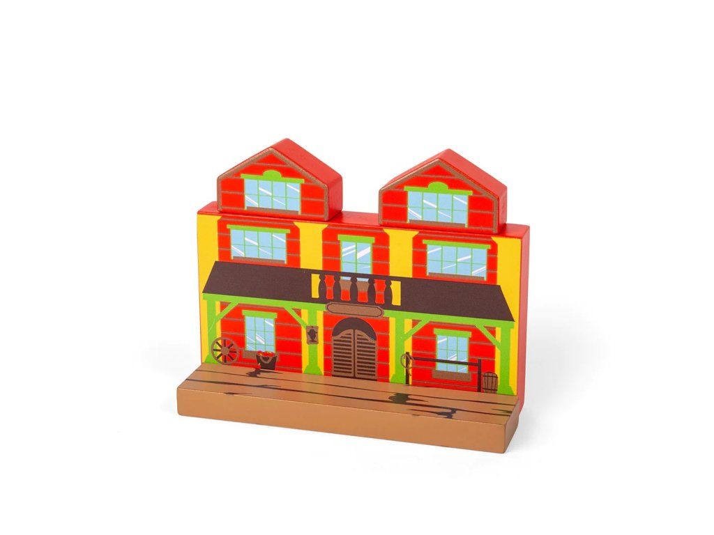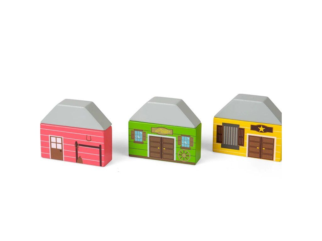 Drevená vlaková súprava s motívom Divokého západu prináša deťom dobrodružstvo priamo do detskej izby. Sada obsahuje celkom 62 dielov, ktoré umožňujú deťom vytvárať rôzne príbehy a scénky z prostredia Divokého západu. Naskočte na vlak a prepravte koče s koňmi po kľukatých drevených dráhach, okolo starého ranča až do horského zlatého dolu. Sada je vyrobená z FSC® dreva a dodávaná s množstvom tematických drevených doplnkov, vrátane figúrok kovbojov, koní, domov, kaktusov a stepného bežca.