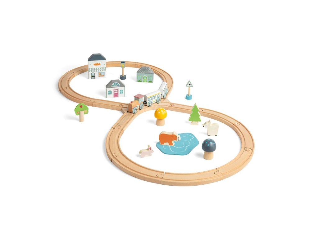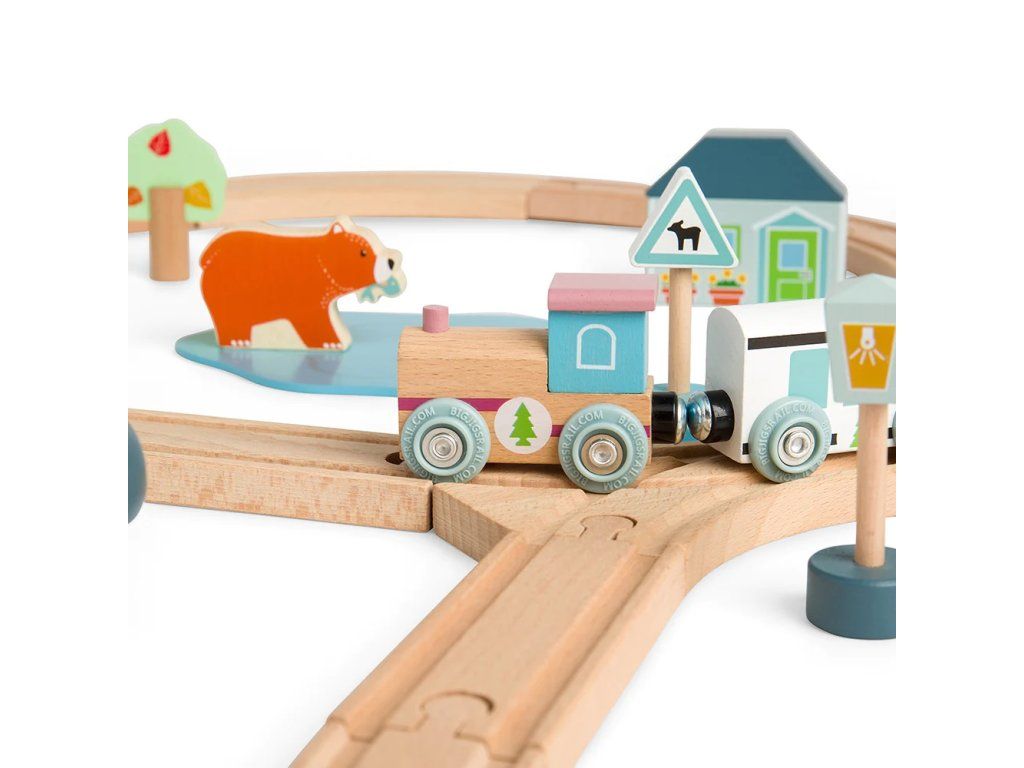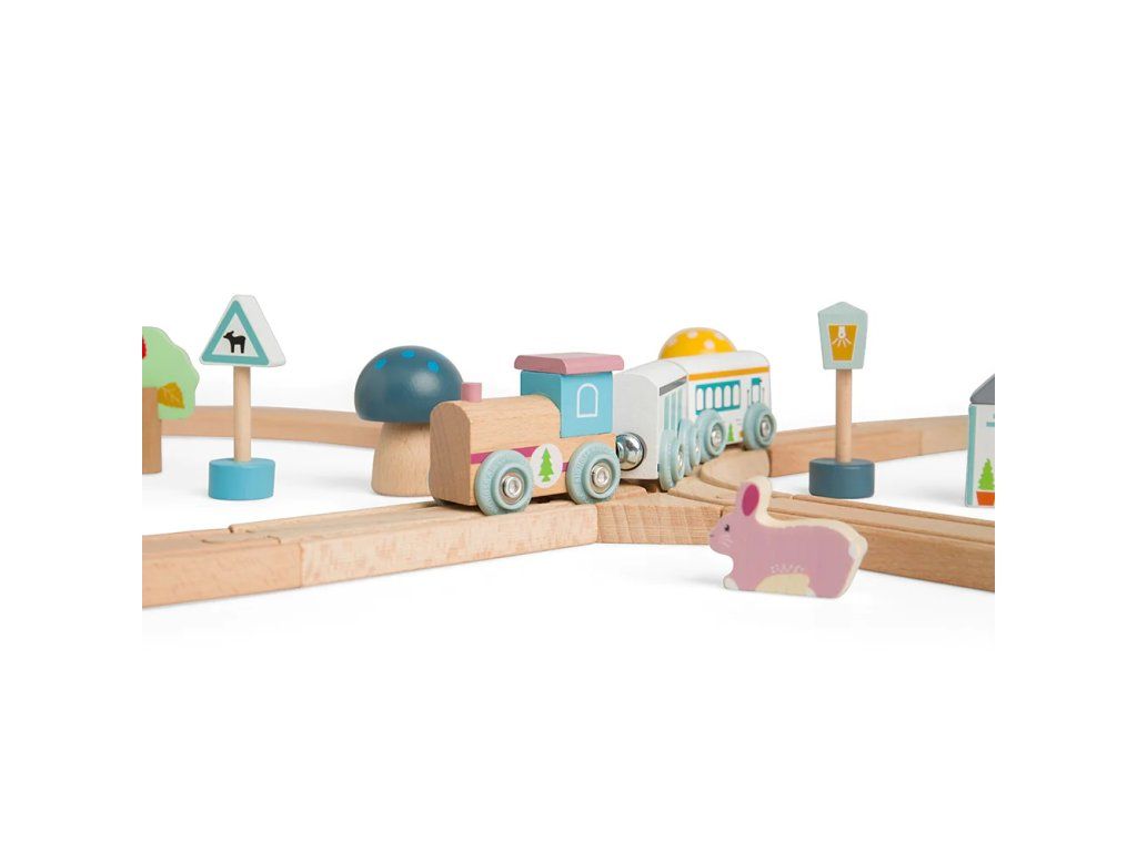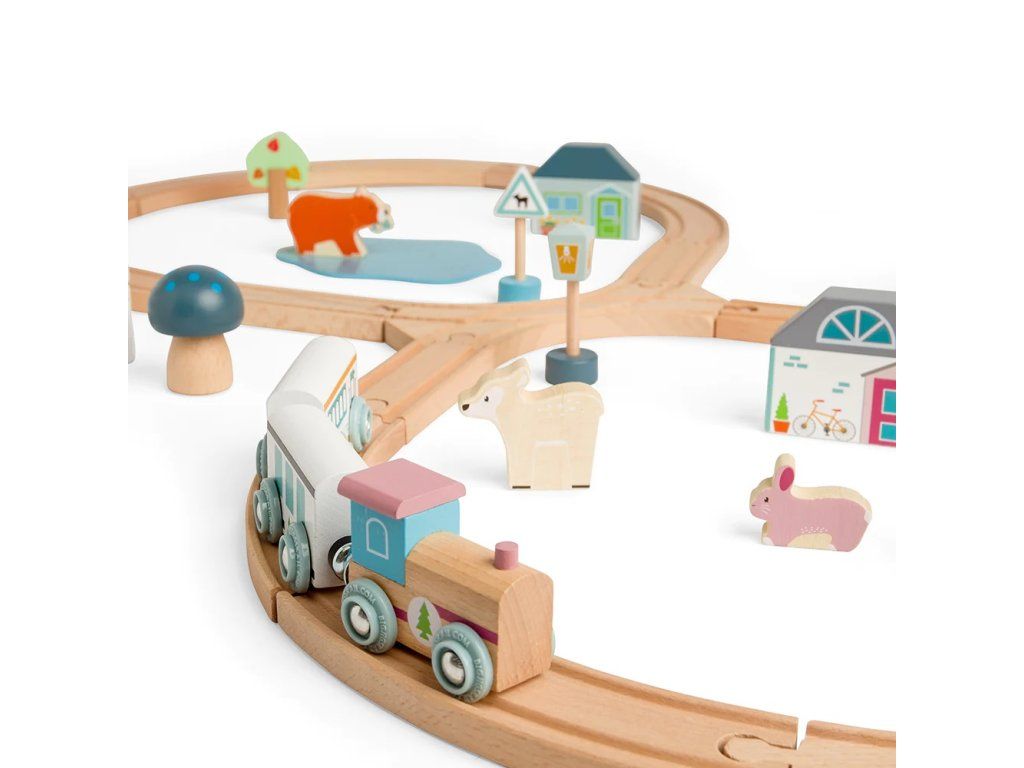Preskúmajte zázraky lesa s touto krásnou drevenou vláčikodráhou. Táto vláčikodráha má tvar osmičky a deti počas jazdy prechádzajú okolo muchotrávok, borovíc a rozkošných lesných zvieratiek, ale aj okolo kaviarne či pekárne.