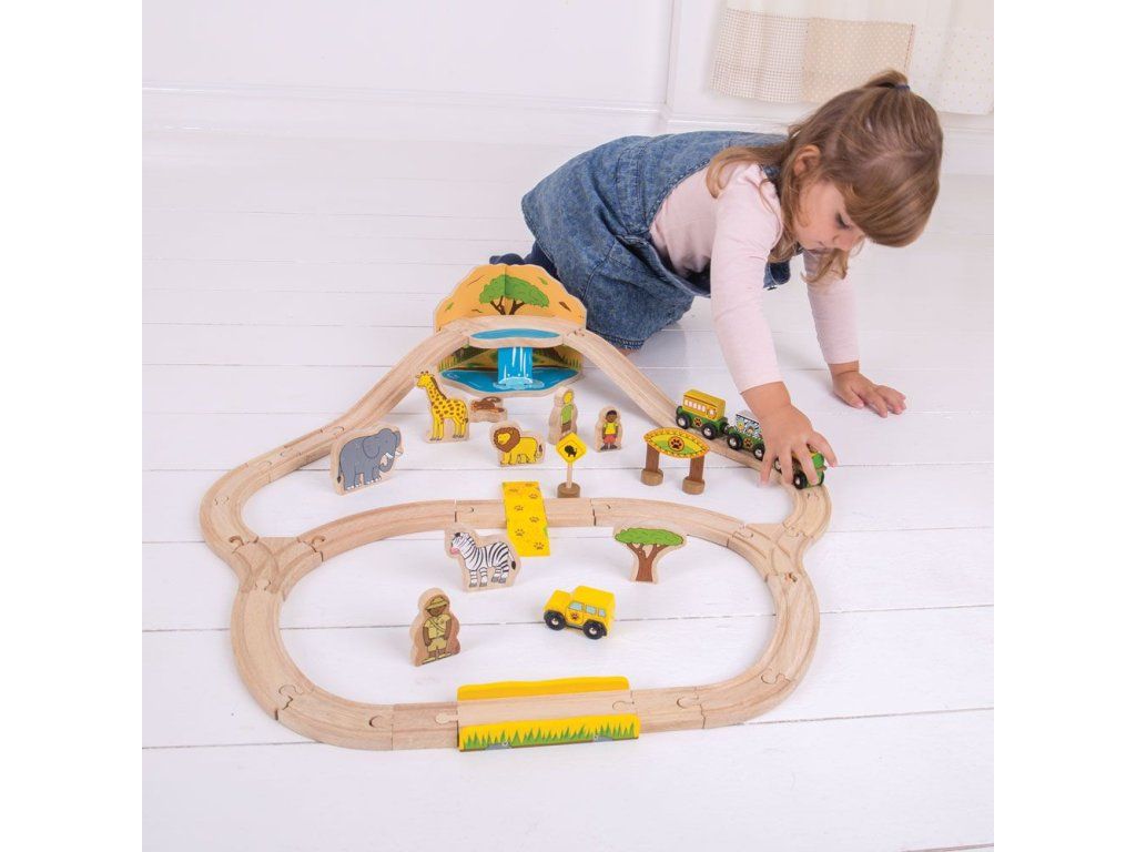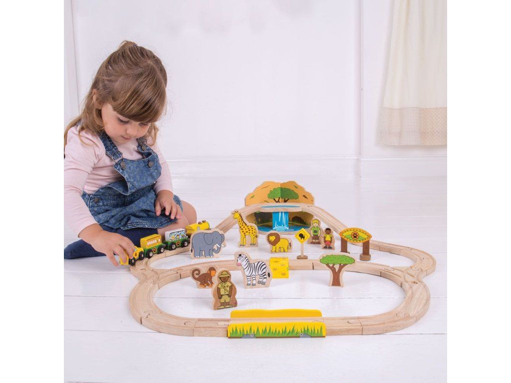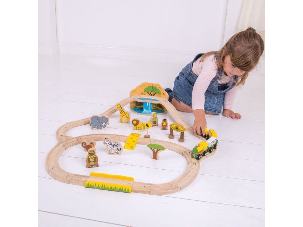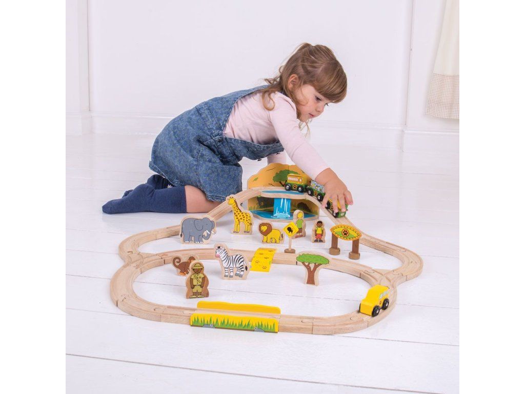 Všetci na palubu! Safari vlak odchádza na Bigjigs Safari dobrodružstvo. Aké divoké zviera stretnete na ceste? Veselá opica alebo obrovská žirafa? Možno dokonca uslyšíte hlasného leva! Táto 38-dielna sada obsahuje kvalitné drevené koľaje, lokomotívu so dvoma vagónikmi, divoké zvieratá vrátane slona, zebry a opice, nápisy, stromy a ďalšie doplnky. Hra podporuje kreatívne myslenie, predstavivosť a koordináciu, rozvíja jemné motorické schopnosti a koordináciu ruka–oko. Magnetické spojky zabezpečujú kompatibilitu s lokomotívami a vozíkmi v rade Bigjigs Rail. K rozšíreniu tejto sady je k dispozícii ďalšie príslušenstvo.