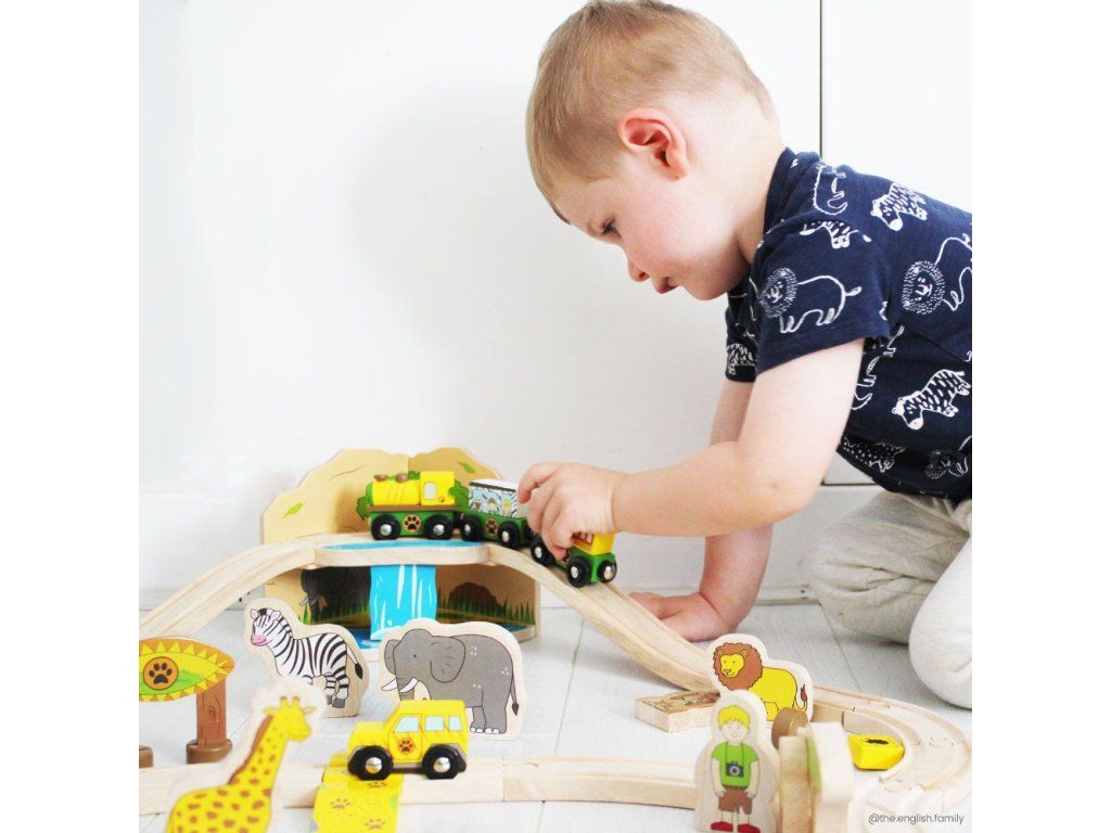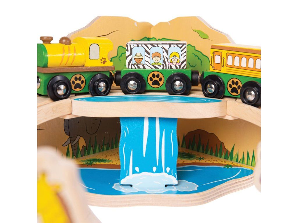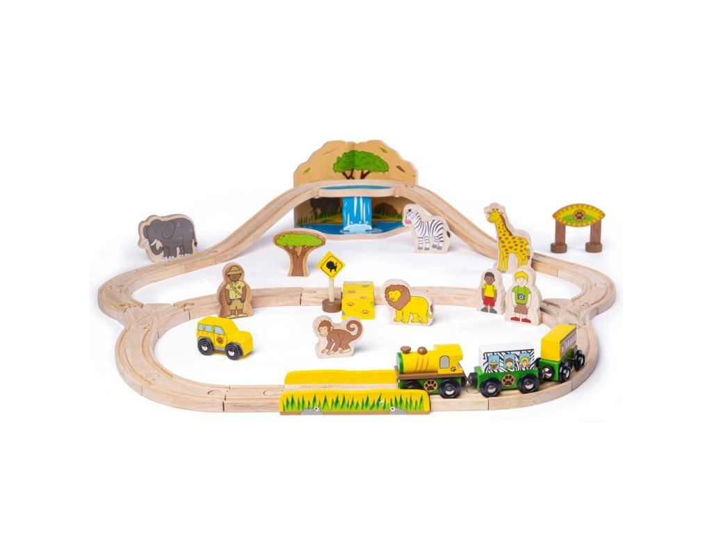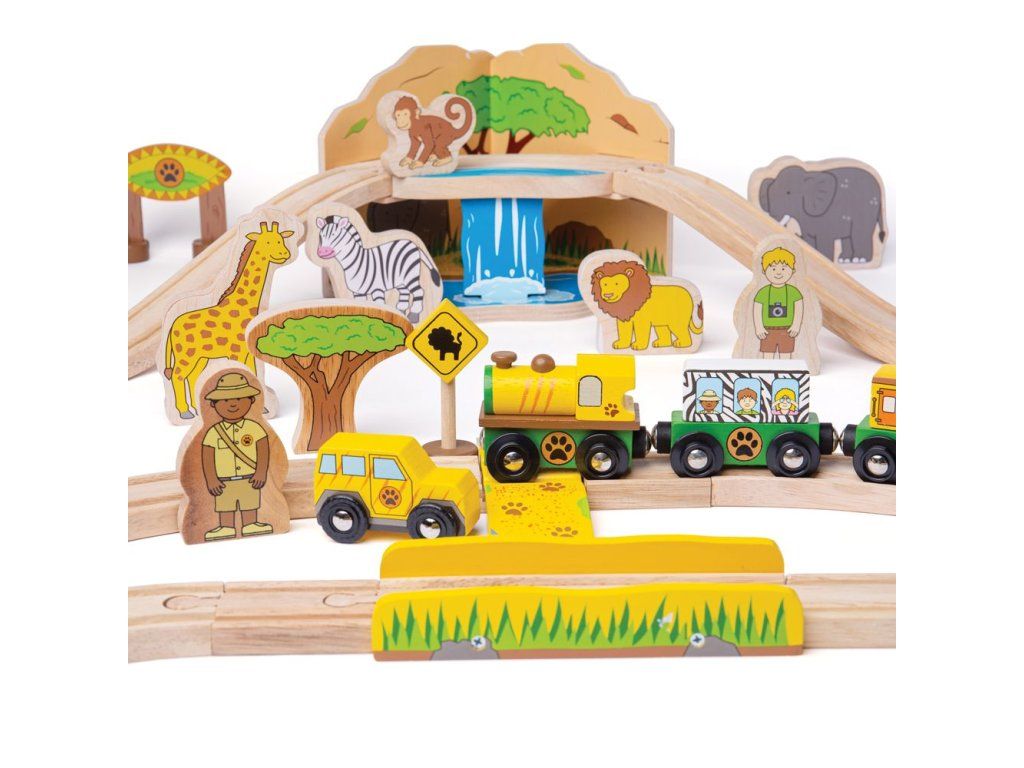 Všetci na palubu! Safari vlak odchádza na Bigjigs Safari dobrodružstvo. Aké divoké zviera stretnete na ceste? Veselá opica alebo obrovská žirafa? Možno dokonca uslyšíte hlasného leva! Táto 38-dielna sada obsahuje kvalitné drevené koľaje, lokomotívu so dvoma vagónikmi, divoké zvieratá vrátane slona, zebry a opice, nápisy, stromy a ďalšie doplnky. Hra podporuje kreatívne myslenie, predstavivosť a koordináciu, rozvíja jemné motorické schopnosti a koordináciu ruka–oko. Magnetické spojky zabezpečujú kompatibilitu s lokomotívami a vozíkmi v rade Bigjigs Rail. K rozšíreniu tejto sady je k dispozícii ďalšie príslušenstvo.