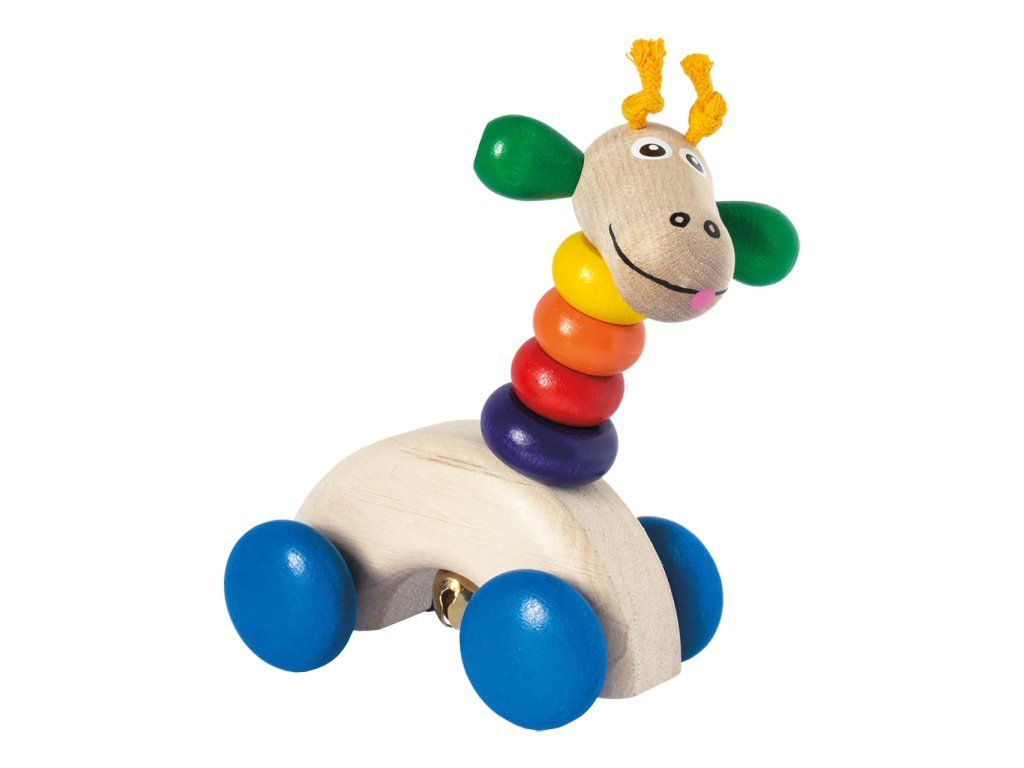 Jazdiaca žirafa s rolničkou a farebným krkom je veselá hračka, ktorá sprevádza deti pri ich prvých objavoch pohybu.