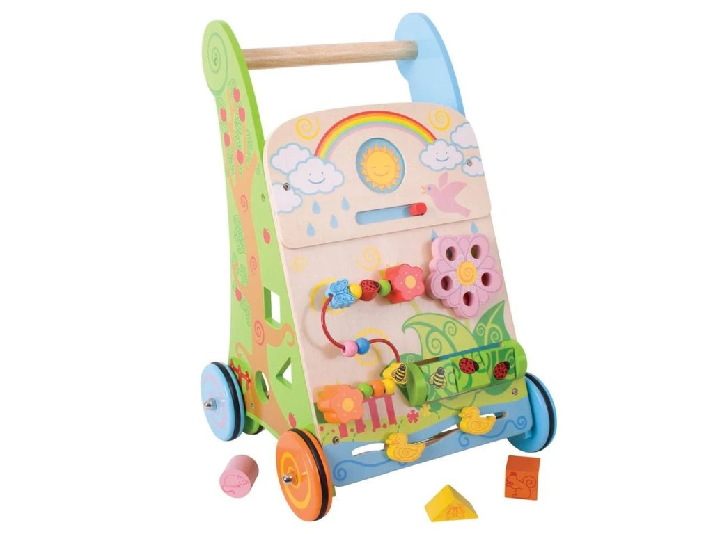 Podporte pohyblivosť a zručnosť vášho dieťatka s týmto chodítkom plným zaujímavých funkcií inšpirovaných prírodou. Pomocou posúvača si vyberte medzi mesiacom a slnkom, roztočte farebnú kvetinu, spojte tri lienky alebo tri čmeliaky otáčaním kociek a pomôžte lienke, čmeliakovi a motýľovi pohybovať sa po korálkovom drôte z kvetiny na kvetinu. Nezabudnite ani na kačičky, ktoré čakajú na plavbu pozdĺž vody!