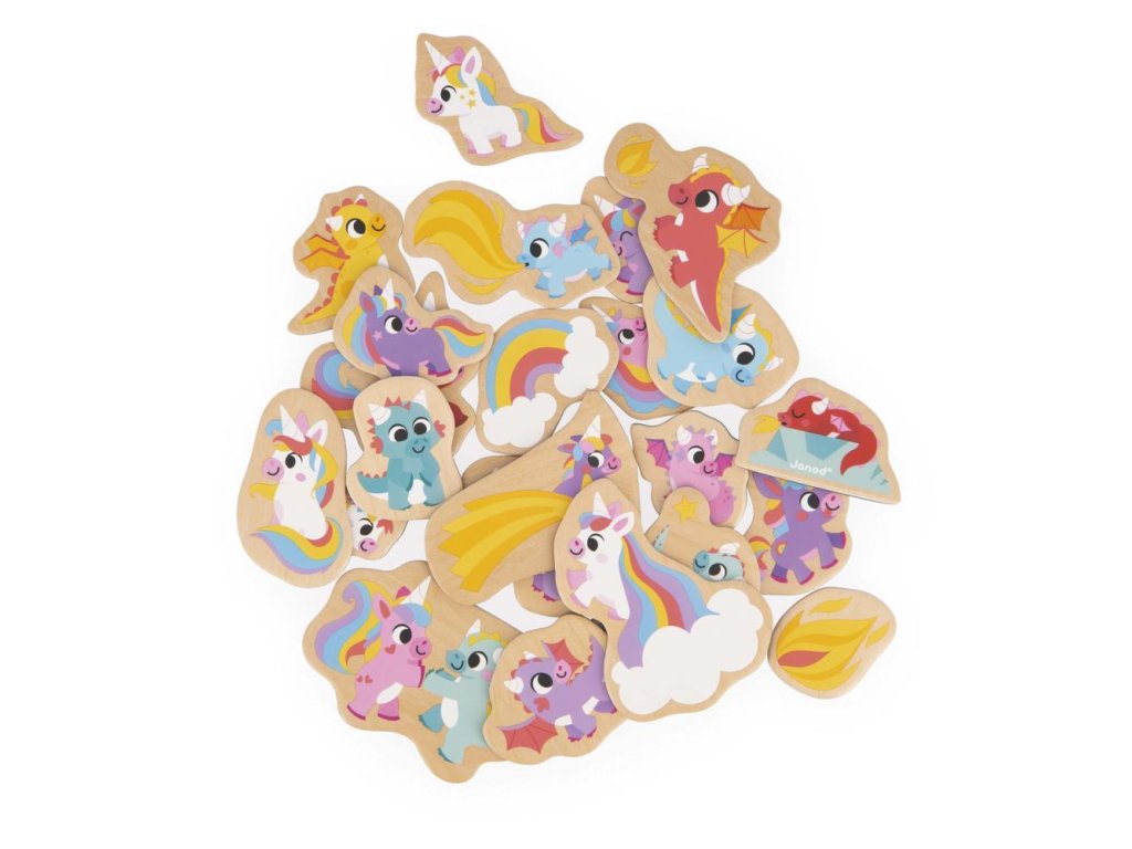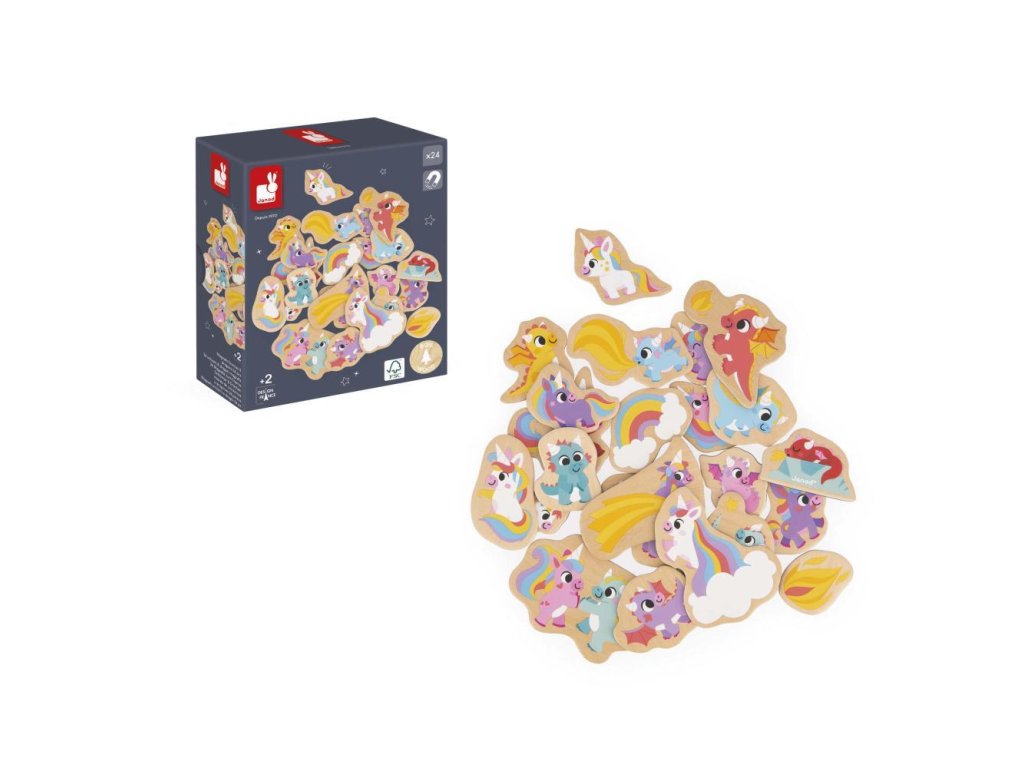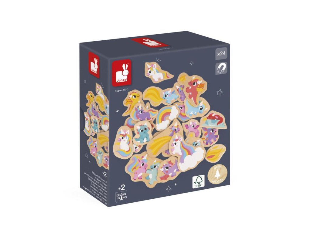 Drevené magnetky Jednorožci a draci – JanodSada drevených magnetiek Jednorožci a draci od francúzskej značky Janod je nádherným darčekom pre malé deti, ktoré milujú rozprávkové svety plné fantázie. Obsahuje 24 drevených magnetov rôznych veľkostí s motívmi jednorožcov, drakov a ďalších čarovných bytostí, ktoré pozývajú deti do sveta kúziel, dobrodružstiev a nekonečných príbehov.