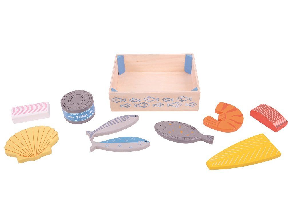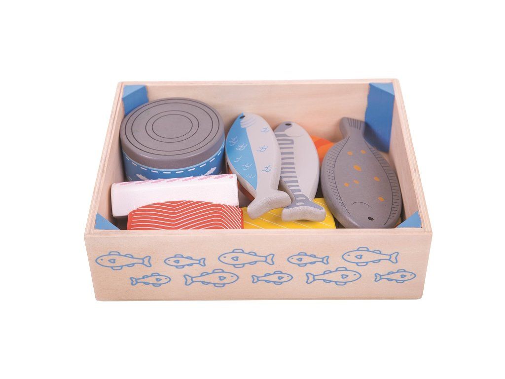 Táto drevená prepravka na ryby je plná čerstvých a zdravých morských dobrôt od rybárov. Obsahuje rôzne druhy potravín, ako je losos, tuniak v konzerve, krevety a ďalšie. Je skvelým doplnkom do detskej drevenej kuchynky pre všetkých malých kuchárov.