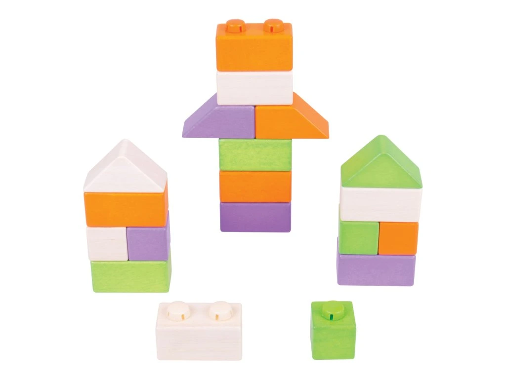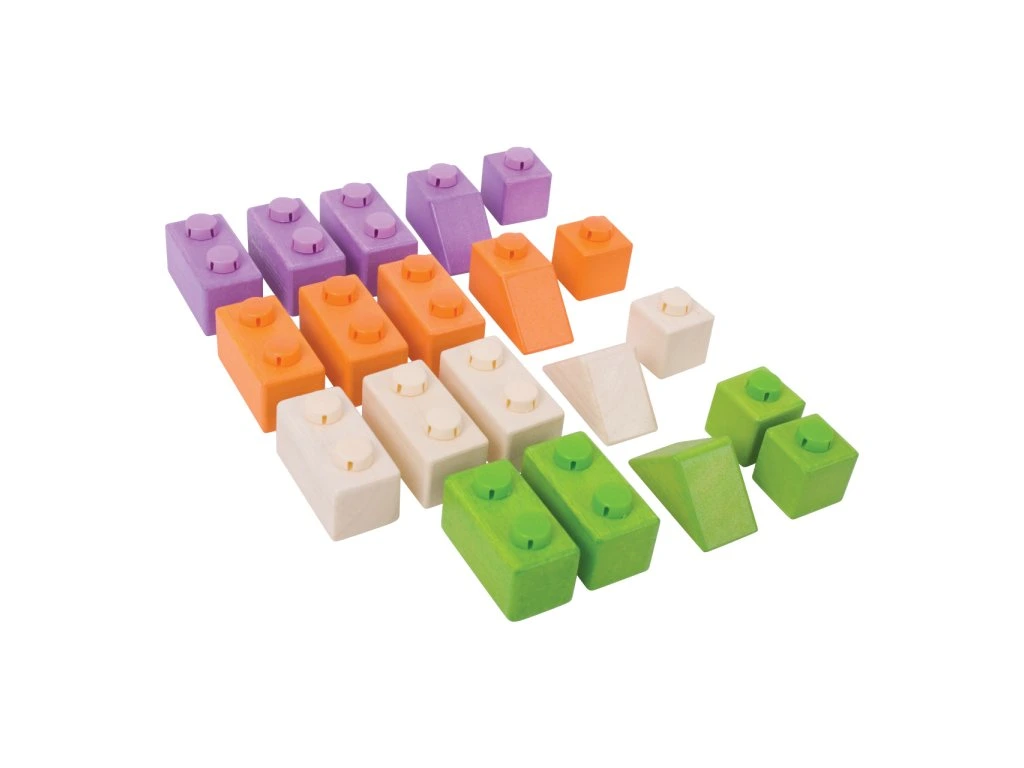 Drevené Spojkocky – unikátna fantastická drevená stavebnica vytvorená spojením dokonale tvarovaných drevených kociek a plastových spojok. Drevené kocky sa dajú vzájomne spájať ľubovoľne, podobne ako stavebnica LEGO. Stredná sada obsahuje 20 ks drevených kociek rôznych tvarov a farieb.