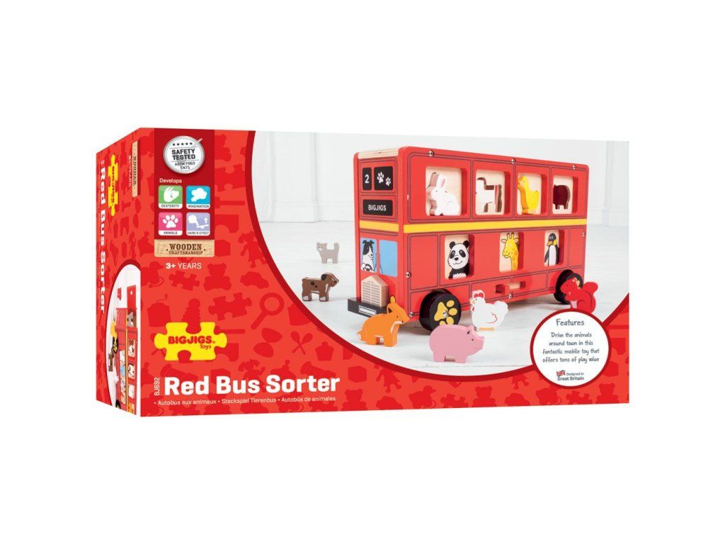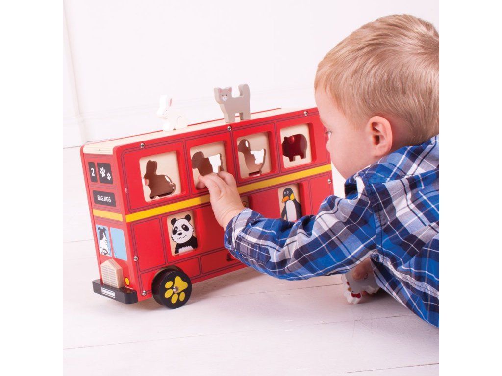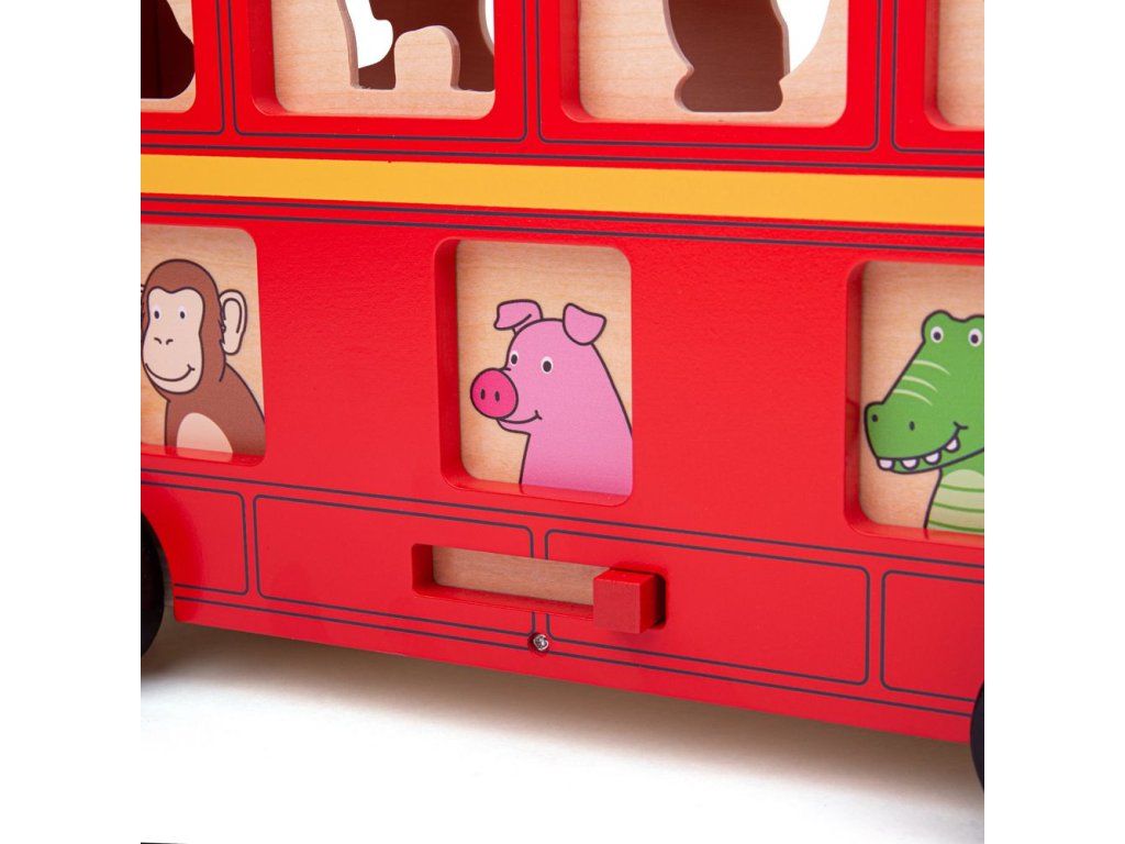 Veľký poschodový triediaci autobus. Prízemie je z jednej strany vybavené posuvnými a z druhej strany otočnými okienkami s rôznymi zvieratkami. Okienka horného poschodia majú presné otvory pre priložené drevené zvieratká.