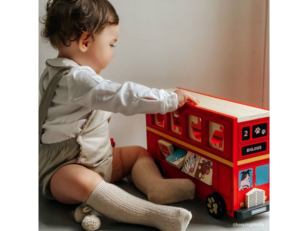 Zadná časť horného poschodia má otváracie dvierka. Drevený autobus je zábavnou didaktickou a motorickou hračkou pre menšie deti.