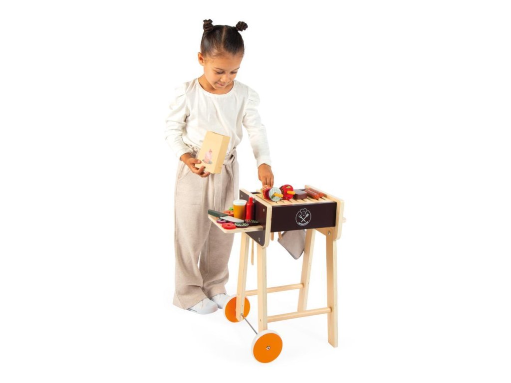 Mobilný gril na stabilných nohách je vybavený dvoma tichými kolieskami, takže sa ľahko presúva. Vďaka pevnej konštrukcii je stabilný a bezpečný pri hre. Prírodný dizajn v kombinácii dreva a hnedo-oranžových tónov z neho robí nielen zábavnú, ale aj krásnu dekoratívnu hračku.