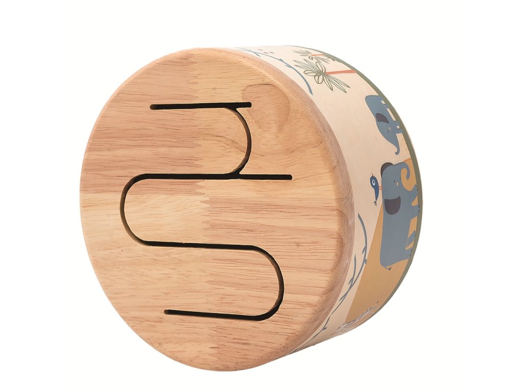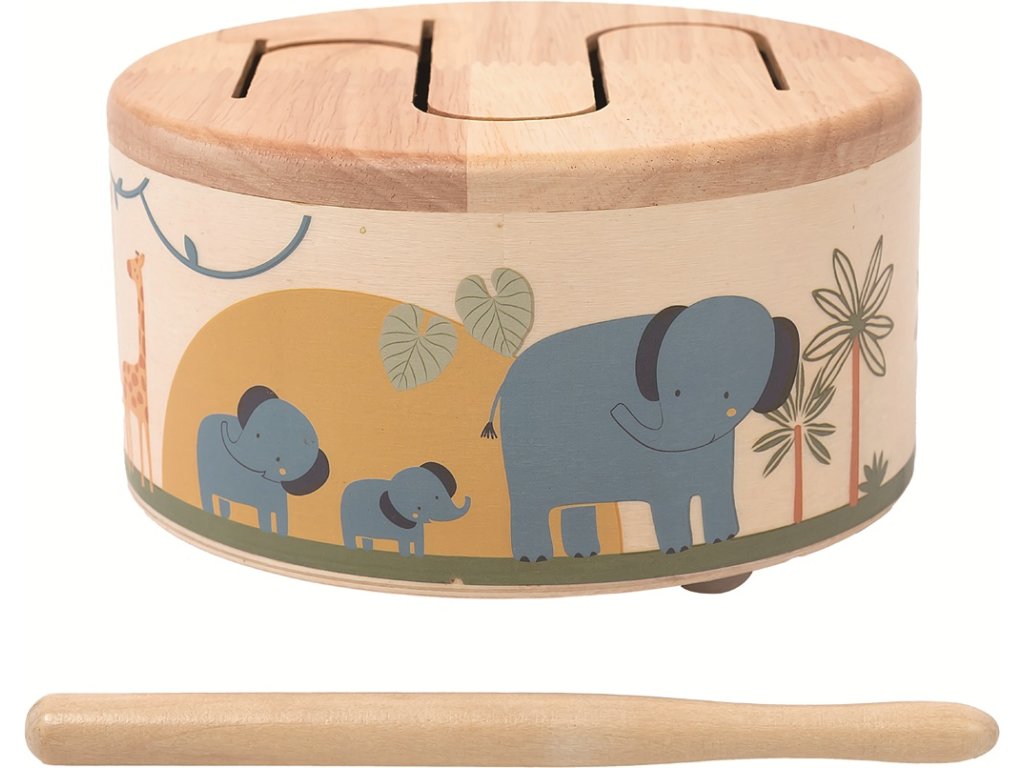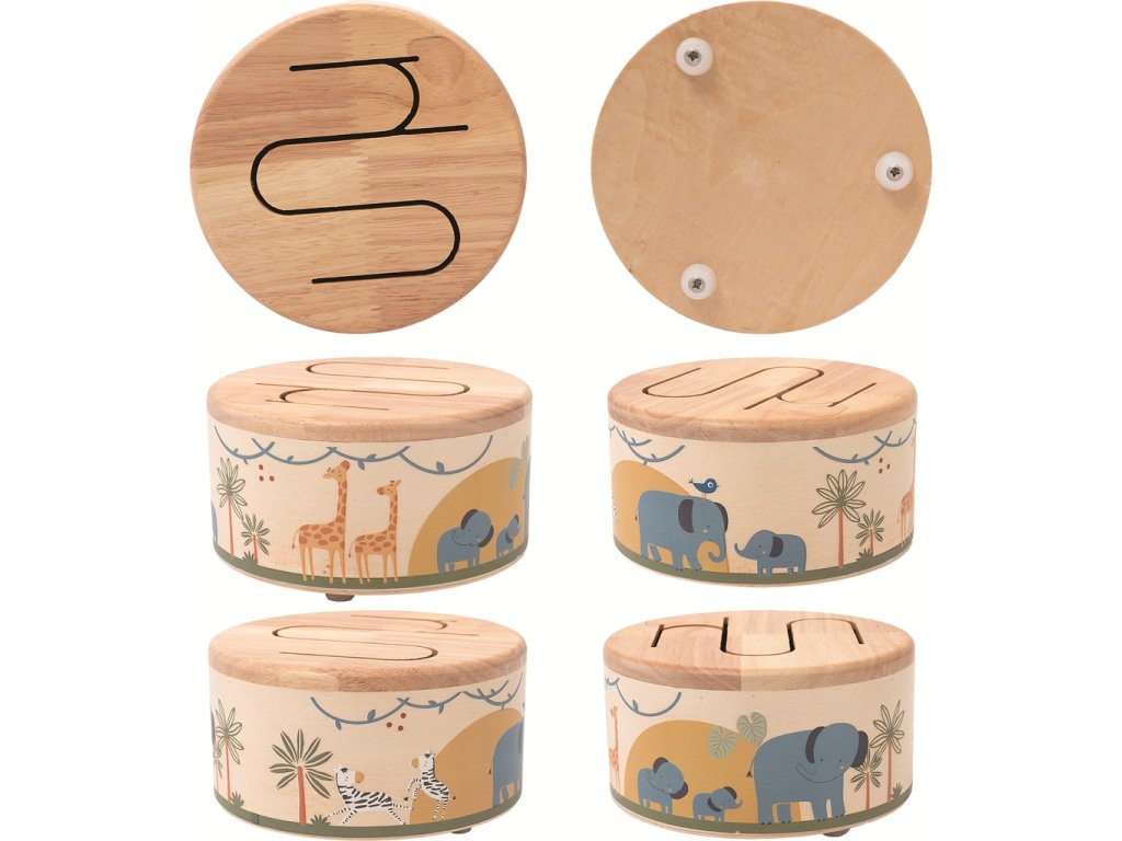 Veselý drevený bubienok s motívmi safari prináša deťom radosť z objavovania rytmu aj sveta zvieratiek. Na bubienku nájdete roztomilé ilustrácie slonov, žiráf a zebier, ktoré očaria každé malé dieťa.