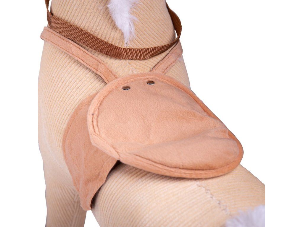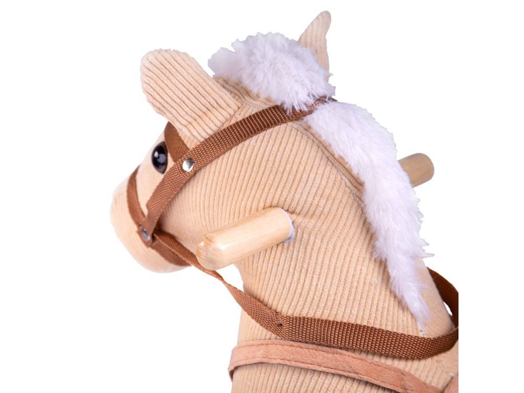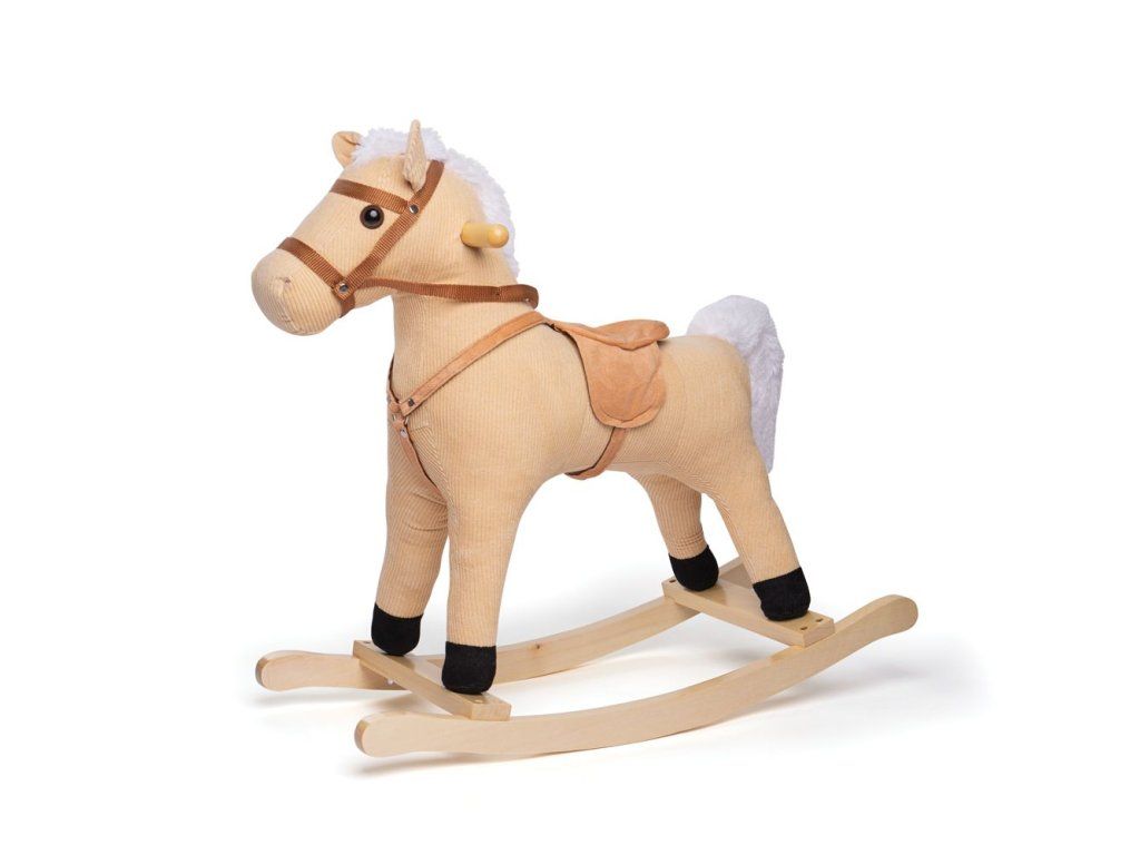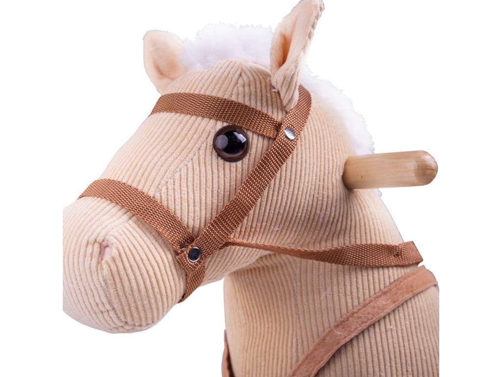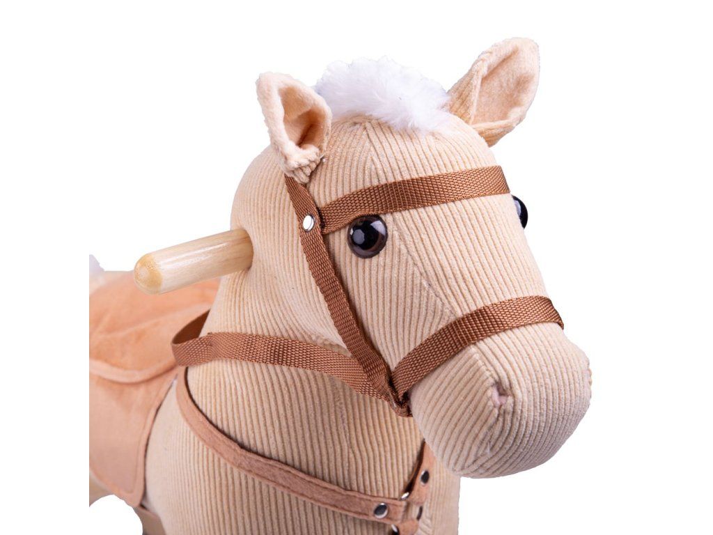 Vyrazte na jazdu! Tento nádherne spracovaný drevený hojdací kôň má hnedý menčestrový poťah s mäkkým sedlom a uzdou.