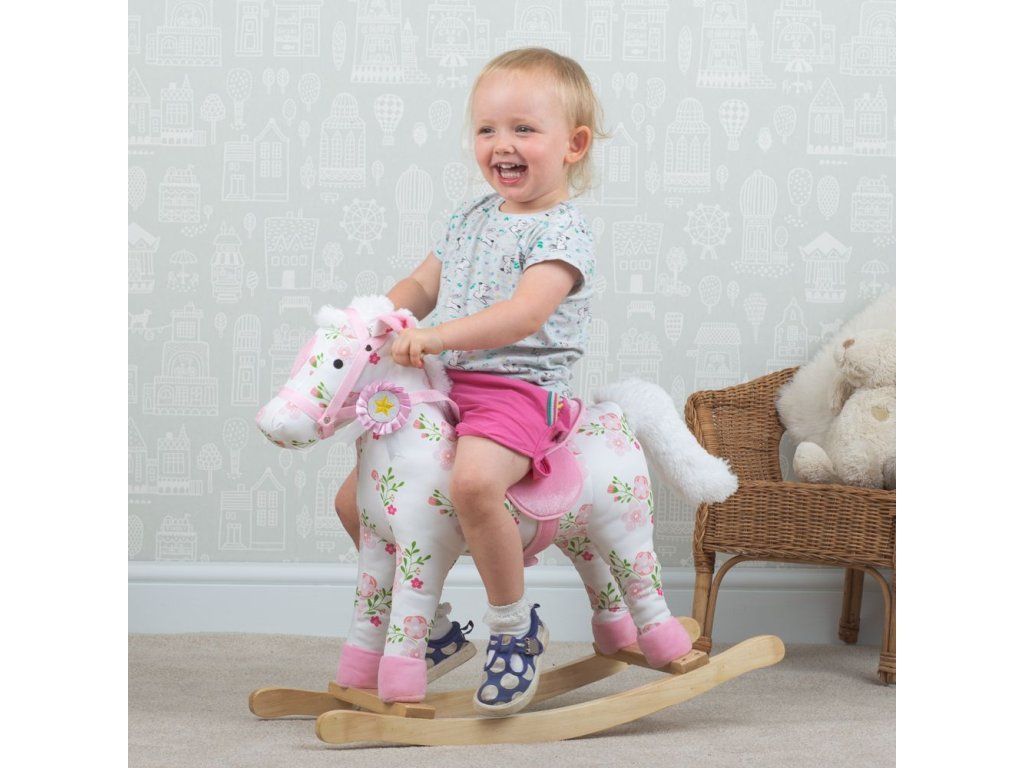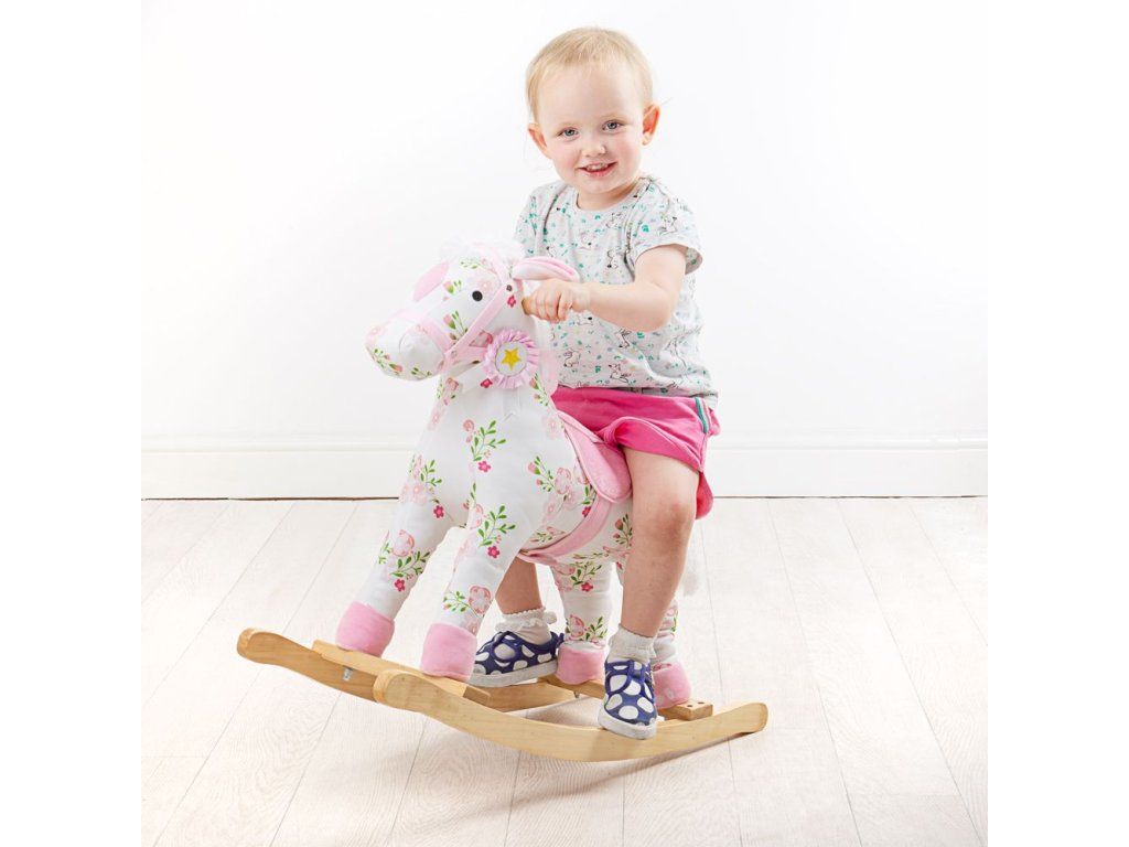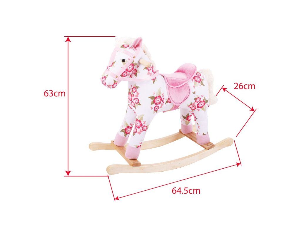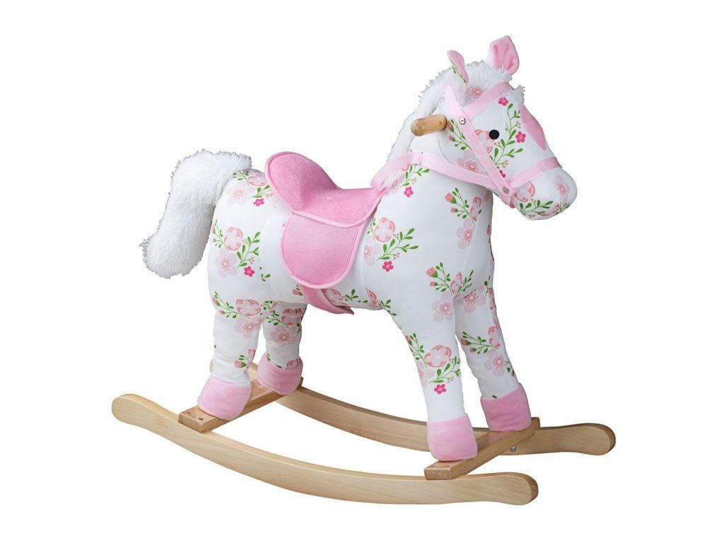 Vyrazte na jazdu! Tento nádherne spracovaný drevený hojdací kôň má jemný kvetinový dizajn s mäkkým ružovým sedlom a uzdou.