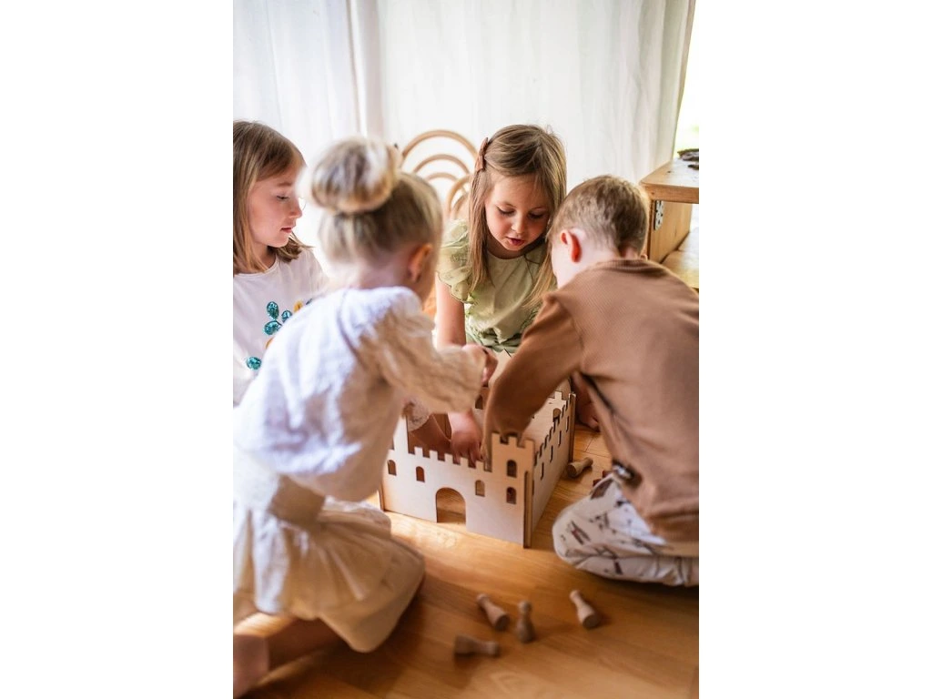 Pre každého rytiera či princeznú je tu panáčikov hrad, ktorý si deti môžu dotvoriť podľa svojej fantázie a vytvoriť si svoj jedinečný svet. Či už použijú pastelky, fixky, vodovky alebo nálepky, výsledkom bude vždy originálne umelecké dielo, na ktoré môžu byť patrične hrdé. Možnosti sú neobmedzené! Tento drevený hrad je ideálnym prostriedkom na rozvoj fantázie a umeleckých zručností. Každý dielik spĺňa prísne bezpečnostné normy a má certifikáciu CE, čo zaručuje bezpečnosť a vhodnosť pre deti od troch rokov. Súčasťou hradu sú aj 2 figúrky dreveného lesného panáčika.