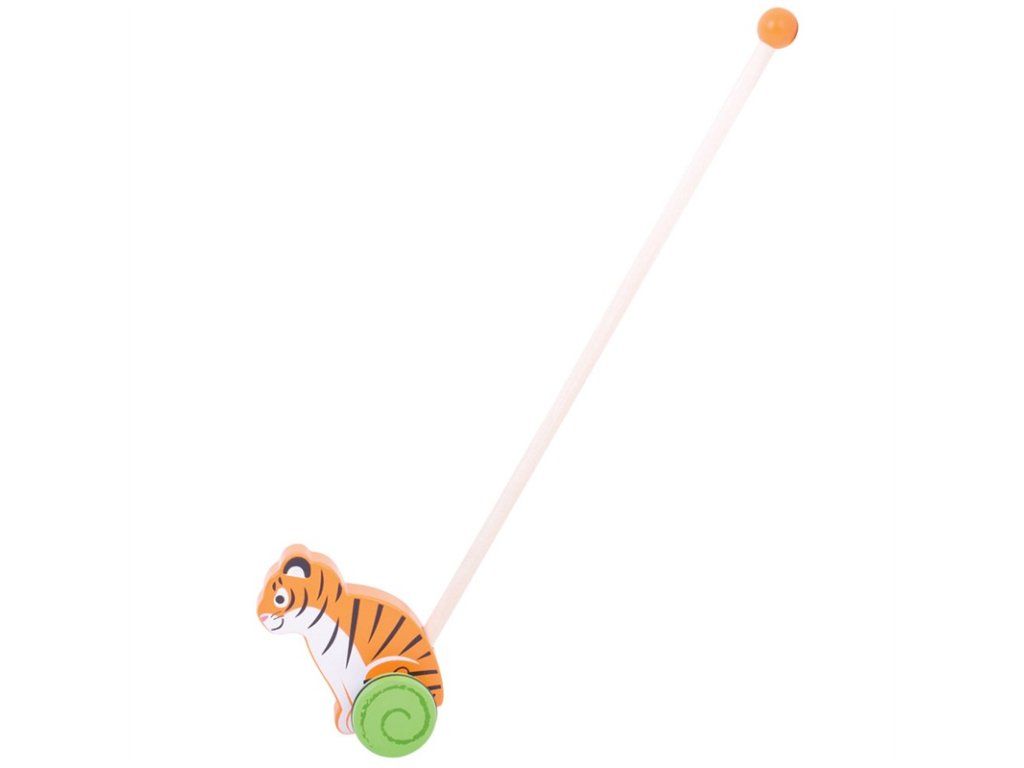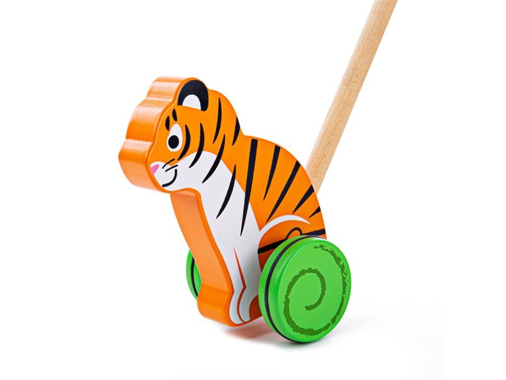 Rovnováha a pohyb sú zručnosti, ktoré deťom tento tiger na kolieskach pomôže rozvíjať. Držadlo je zakončené guľôčkou, takže ho dieťa ľahko uchopí a môže tigra strkať alebo ťahať doma aj vonku.