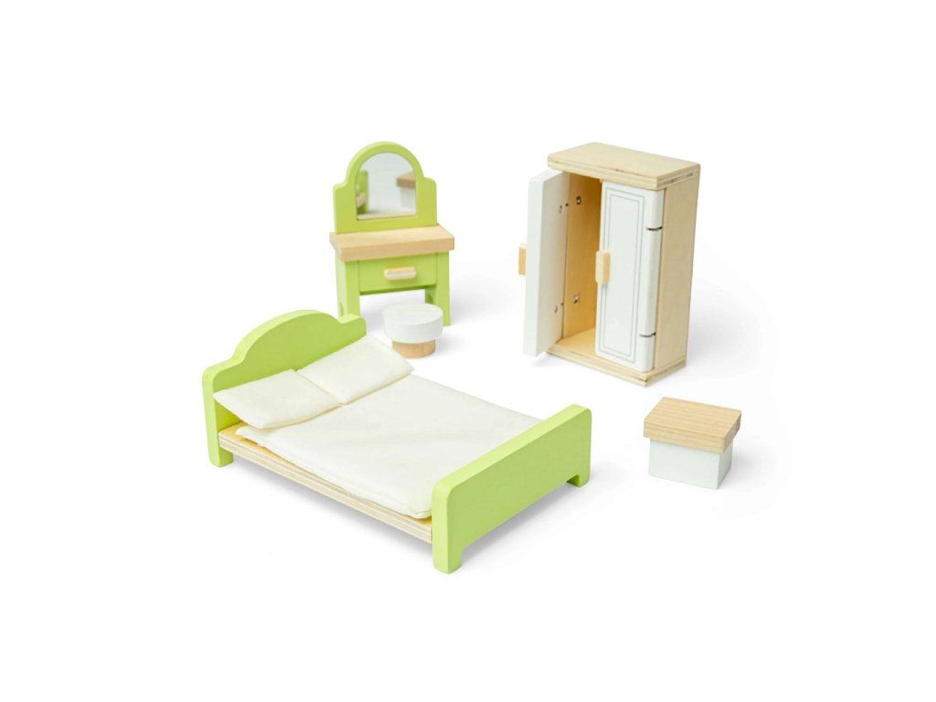 - obsahuje: posteľ pre bábiky, šatníkovú skriňu, nočný stolík, toaletný stolík, stoličku