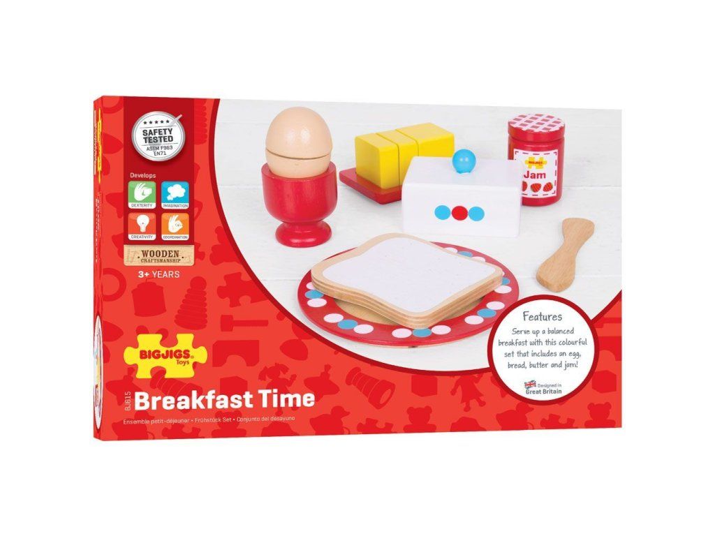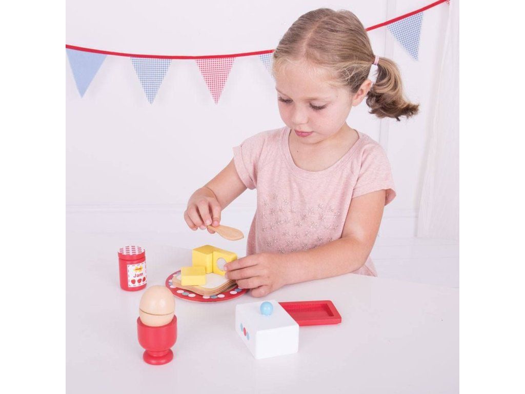 Podávajte vyvážené raňajky s touto farebnou drevenou raňajkovou sadou, ktorá obsahuje vajíčko, chlieb, maslo a džem.