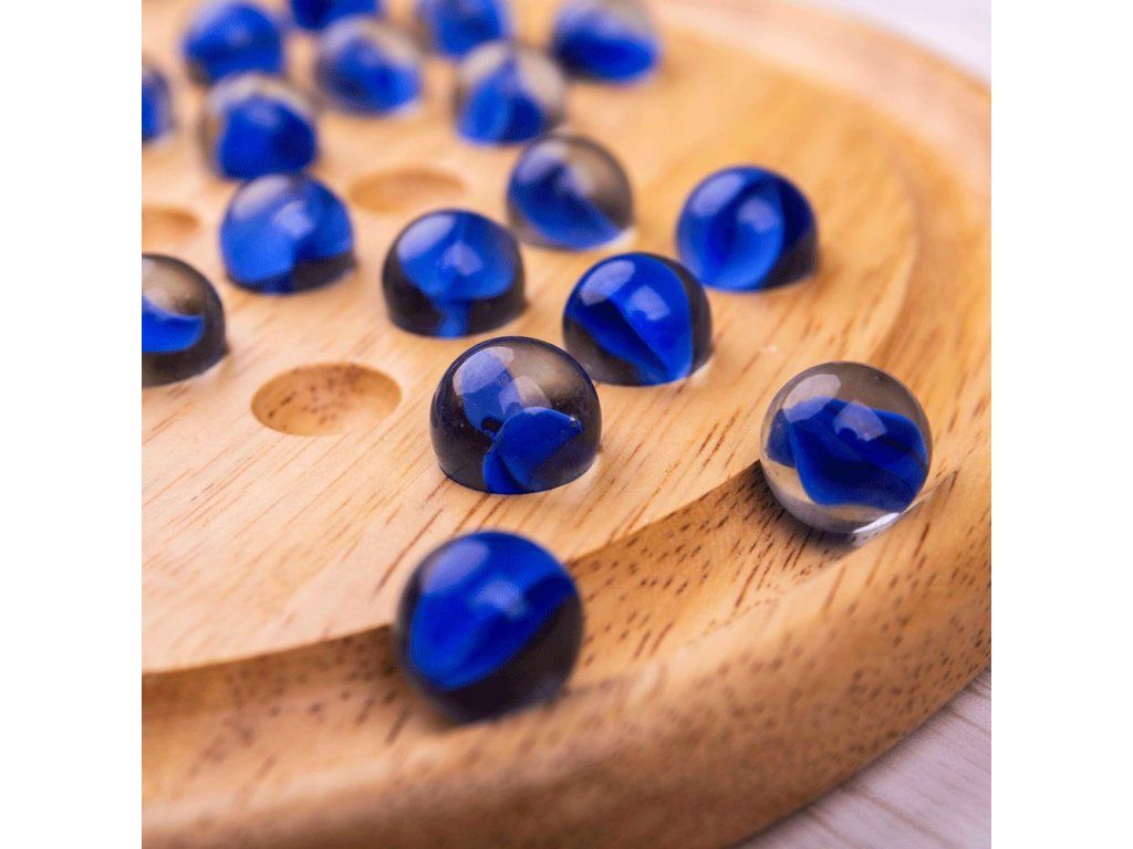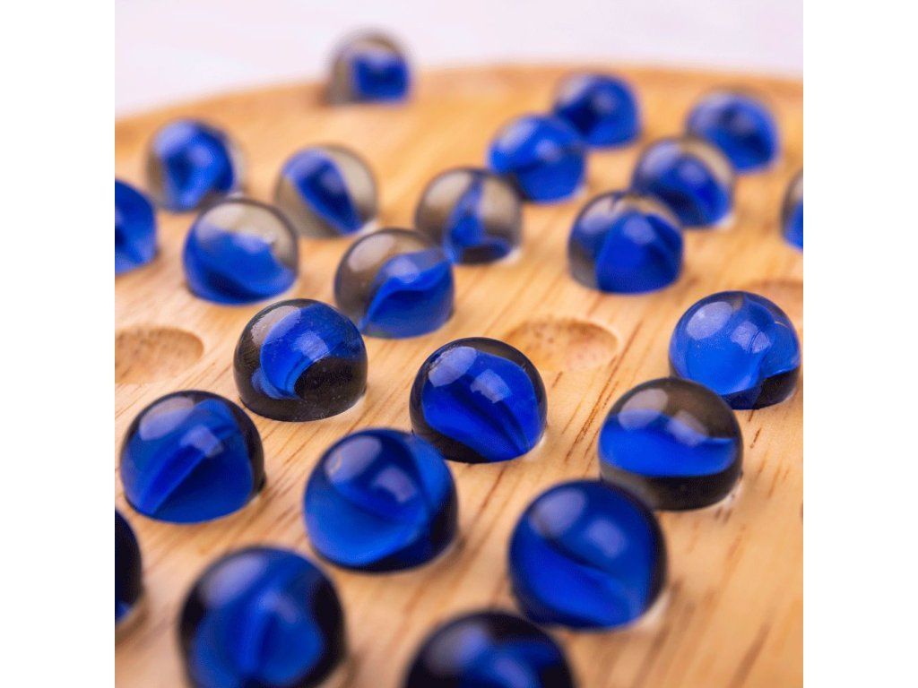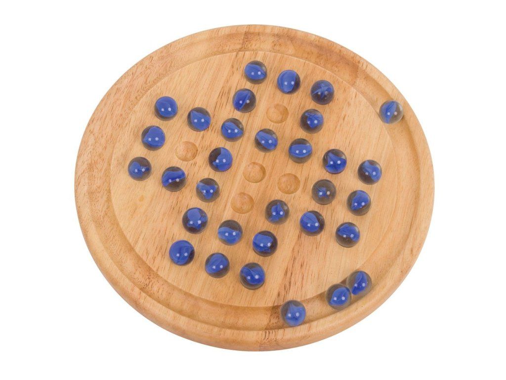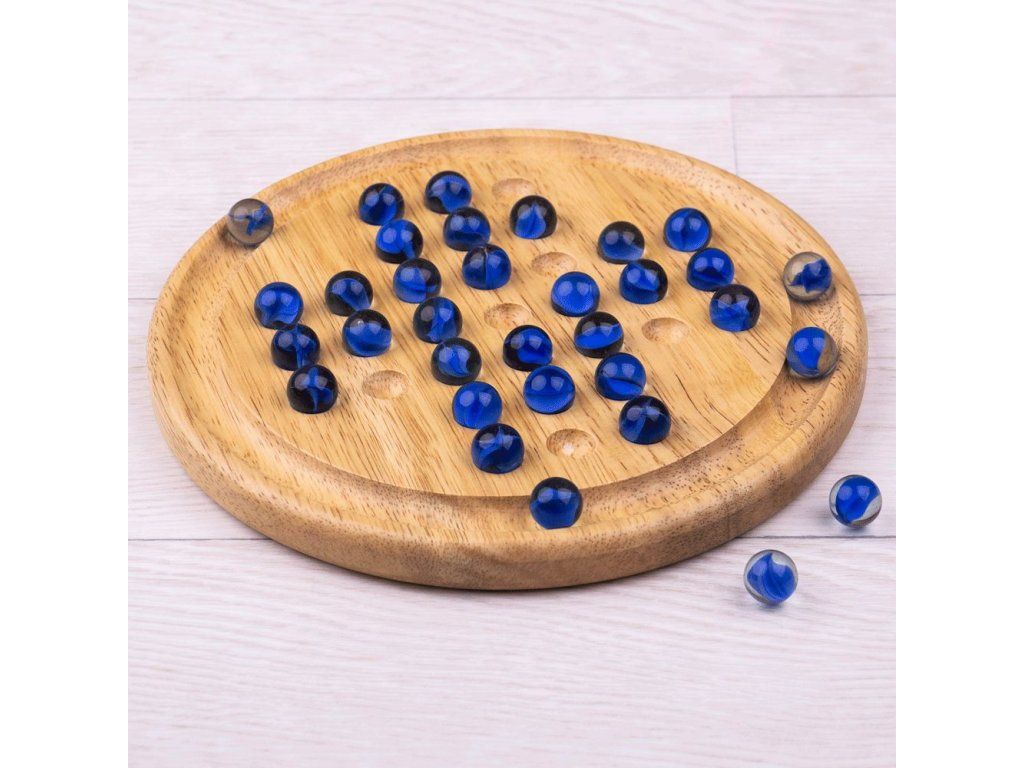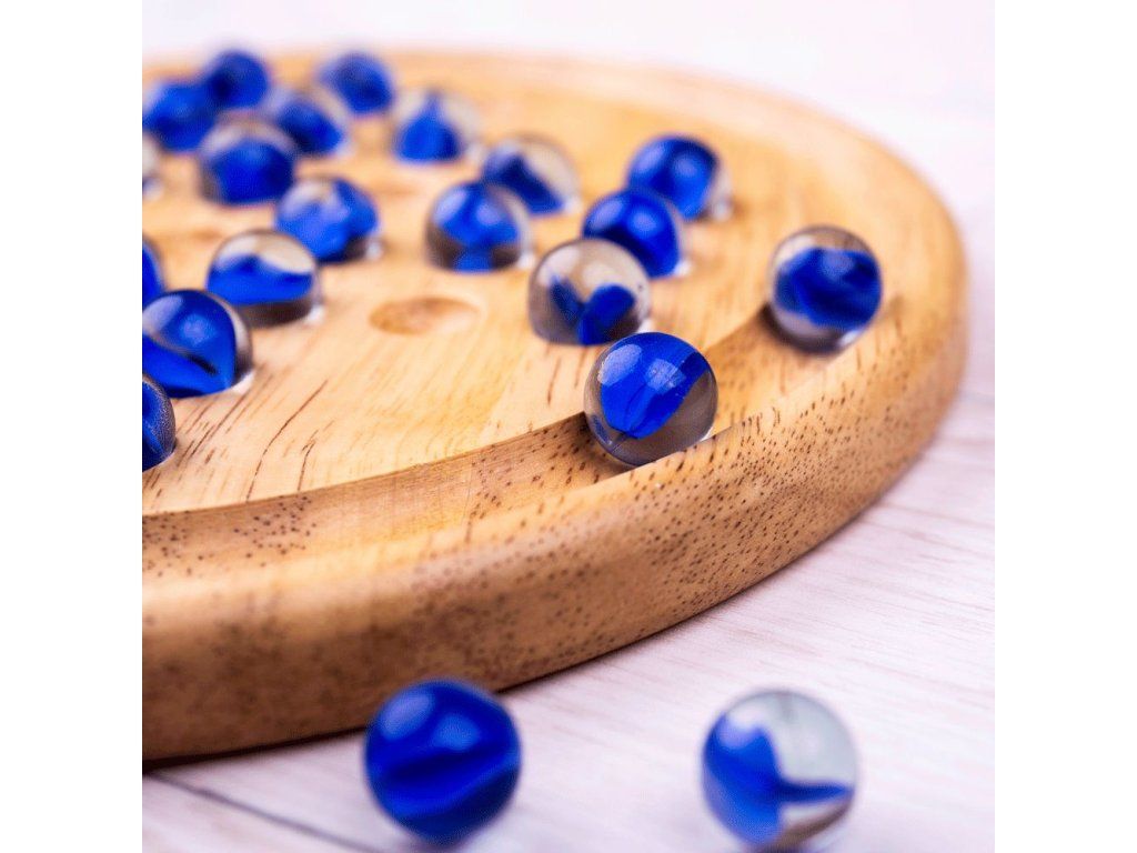 Táto drevená sada solitaire obsahuje lesklé guľôčky na kruhovej drevenej doske.