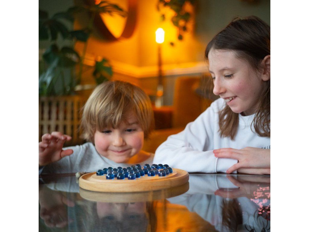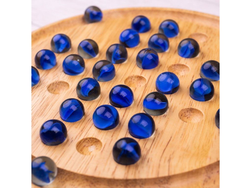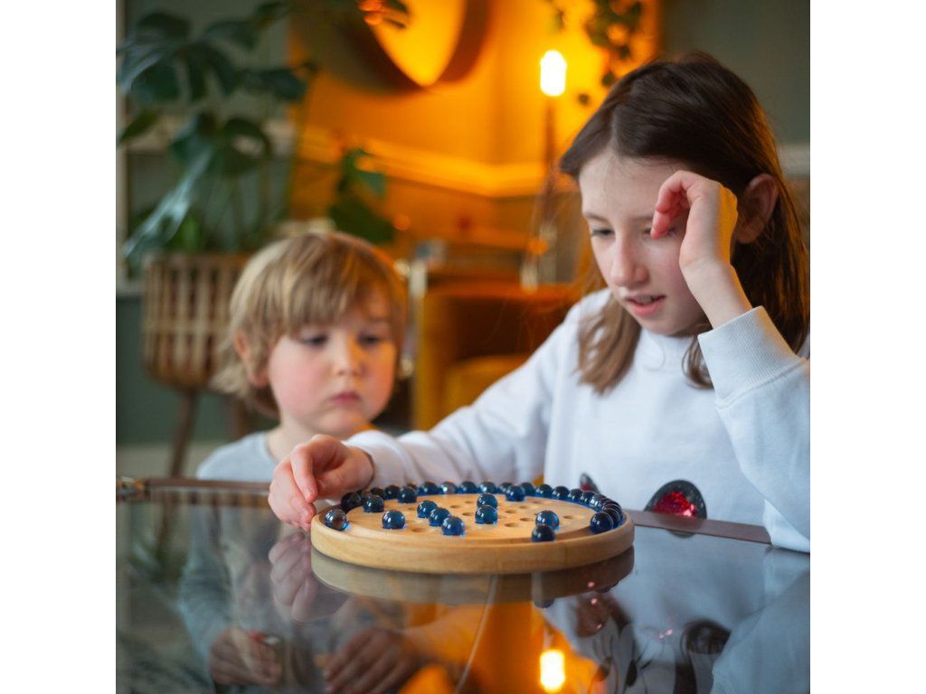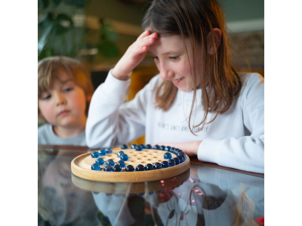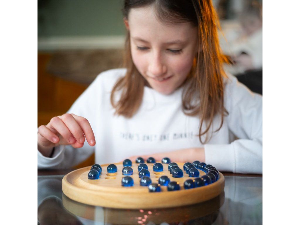 Táto drevená sada solitaire obsahuje lesklé guľôčky na kruhovej drevenej doske.