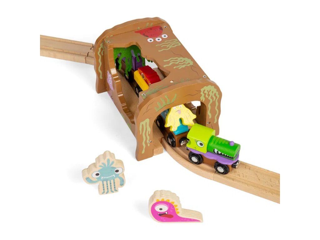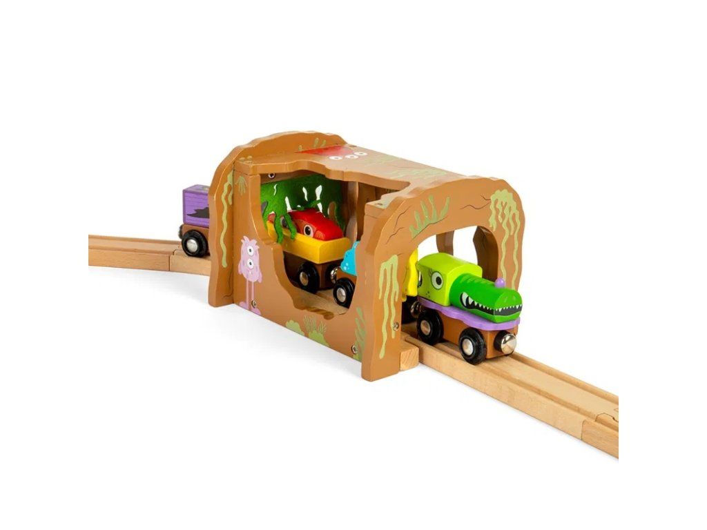 Užite si príjemné mrazenie v chrbte so strašidelným tunelom plným príšeriek! Vláčik musí prejsť tunelom vyzdobeným obrázkami, s visiacou žltou príšerou na jednej strane a plsteným slizom na druhej. Strašidelný tunel je zábavným doplnkom k vláčikodráhe Príšerky a skvelým spôsobom, ako podporiť kreatívne myslenie detí. Hra pomáha zlepšiť sociálne a jazykové zručnosti a schopnosti rozprávania. Vláčik s príšerkami nie je súčasťou balenia.