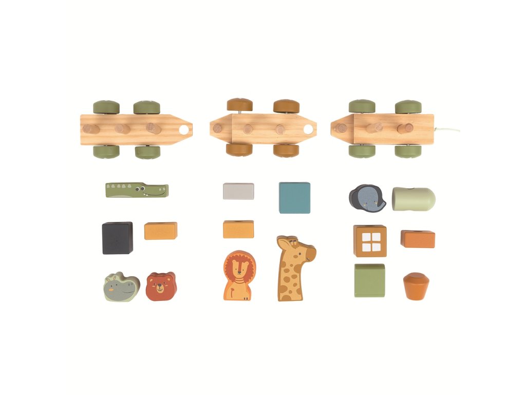Na drevených podvozkoch sú umiestnené tyče, na ktoré deti nasadzujú kocky rôznych tvarov a skladajú tak farebný vláčik. Súčasťou sú aj kocky v tvare zvieratiek – žirafa, slon, medveď, lev, hroch a krokodíl.