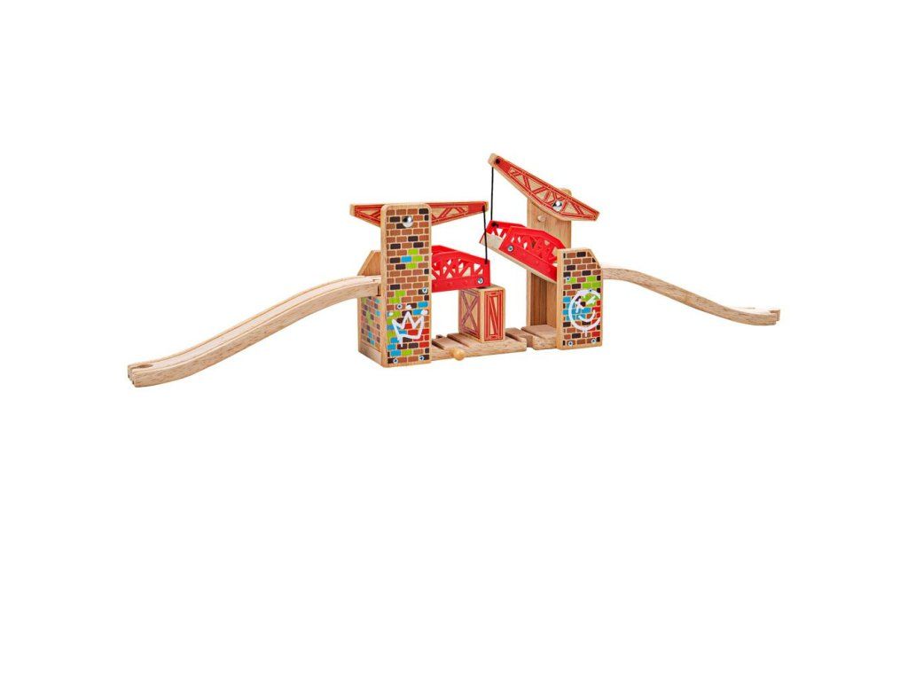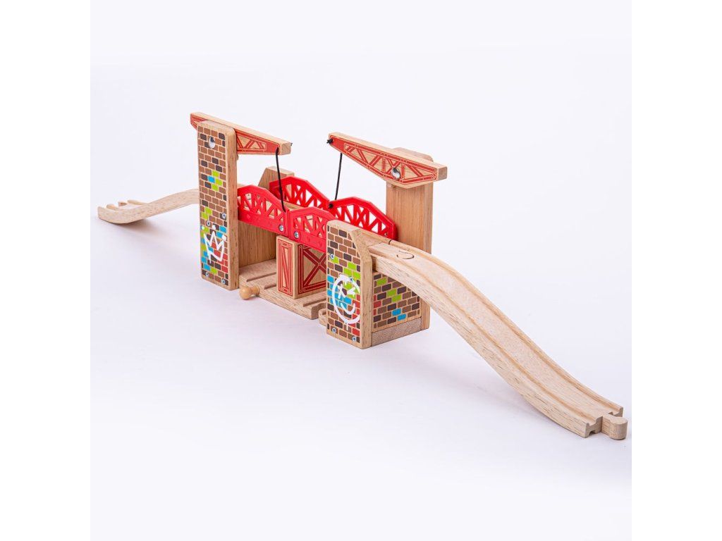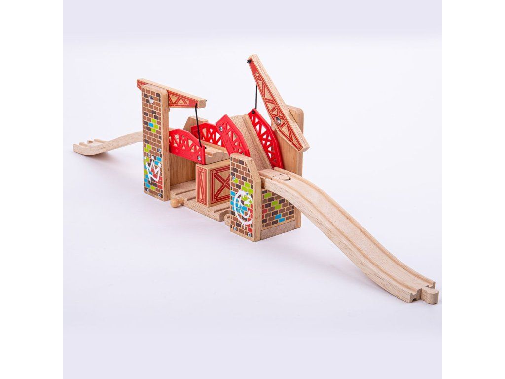 Dvojitý zdvíhací most – obe strany sa zdvíhajú a ponechávajú dostatok miesta pre súbežný prejazd 2 vlakov. Alebo sklápajte boky, aby vlak mohol prejsť cez vrchol!