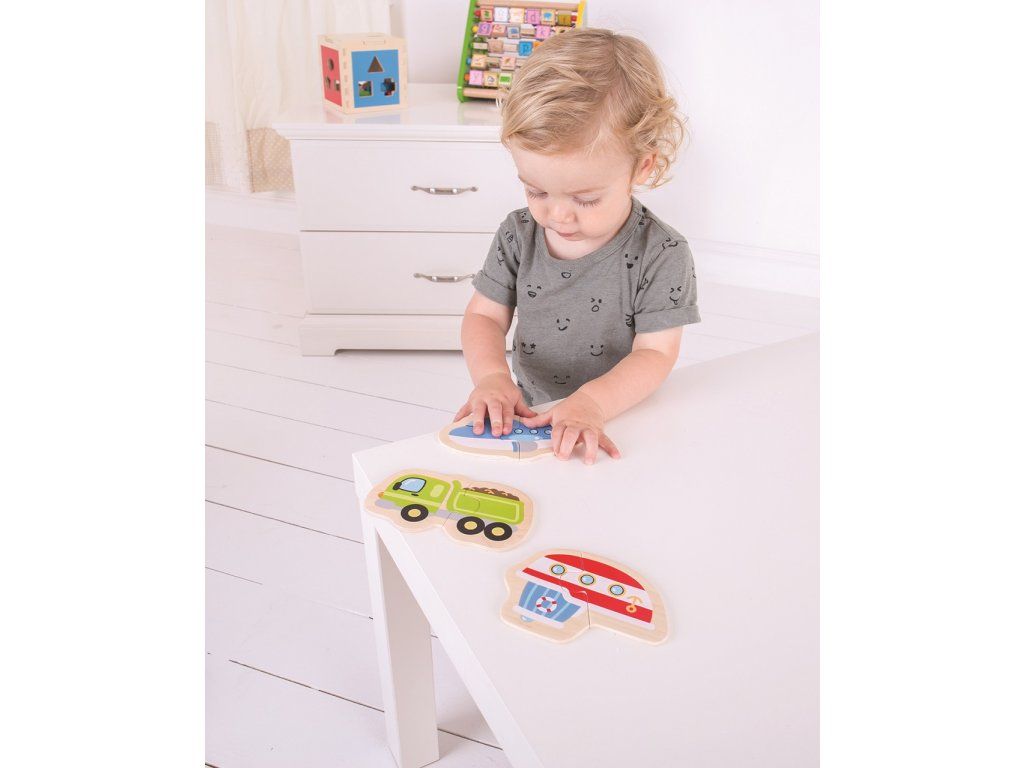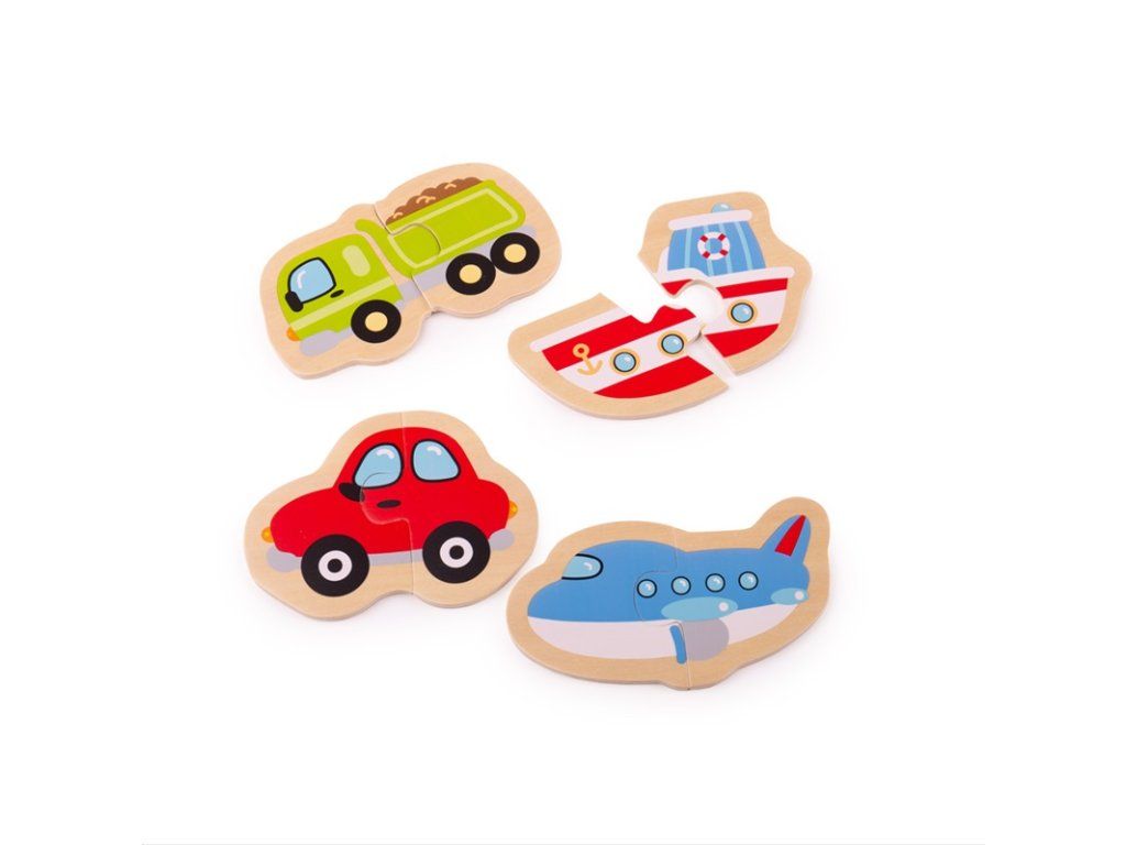 Malí hráči musia správne prispôsobiť každý z 8 drevených dielikov tak, aby vytvorili štyri farebné dopravné prostriedky. Po dokončení skladačky sú deti prirodzene povzbudzované, aby o jednotlivých obrázkoch rozprávali. Dieliky sú ideálne prispôsobené pre malé rúčky, ktoré ich zdvíhajú, uchopujú a ukladajú na správne miesto. Hračka je skvelým spôsobom, ako rozvíjať slovnú zásobu, zručnosť, jemnú motoriku, schopnosť priraďovania a sústredenie, zároveň podporuje rozpoznávanie tvarov a farieb. Vyrobené z vysoko kvalitných, zodpovedne získaných materiálov. Zodpovedá aktuálnym európskym bezpečnostným normám. Obsahuje 8 dielikov.