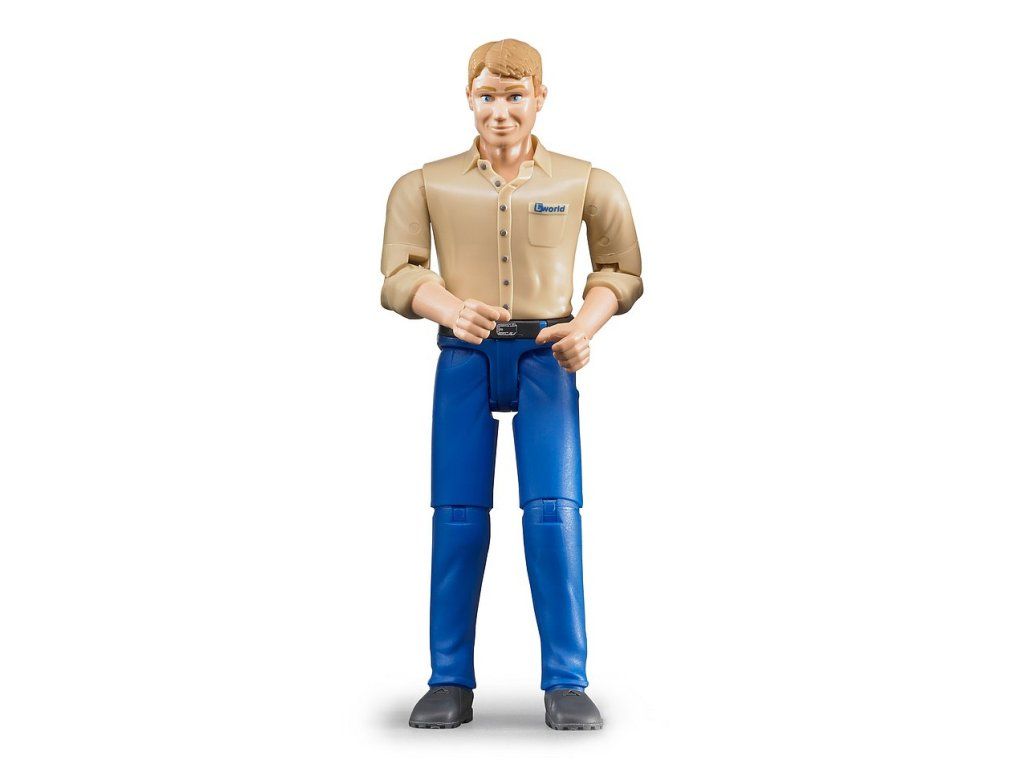 Figúrka zobrazuje muža v béžovej košeli a modrých nohaviciach a je skvelým doplnkom pre realistické hry s modelmi značky Bruder.