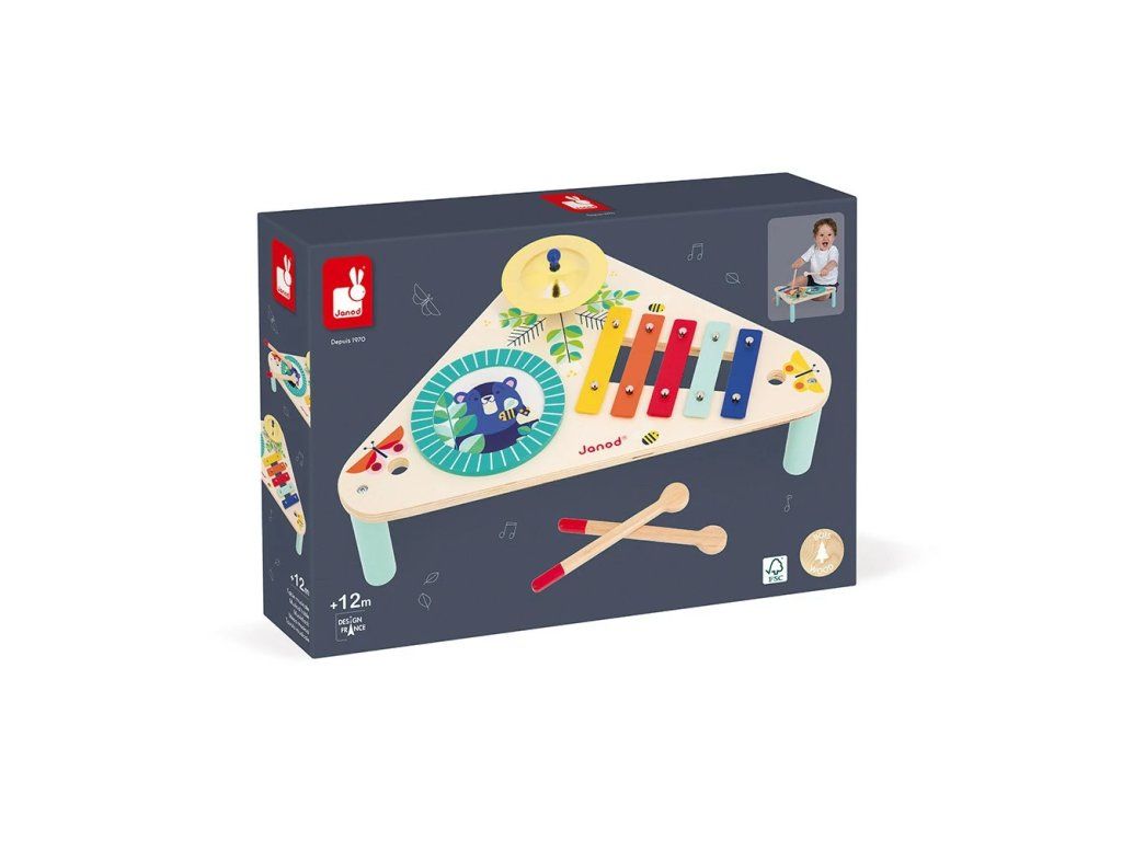 Koncert môže začať! Tento farebný hudobný stolík ponúka deťom možnosť objavovať hudbu a rozvíjať zmysel pre rytmus. Stôl obsahuje činelu, bubon a xylofón, pričom paličky možno uložiť do praktických otvorov po stranách stola, aby sa nestratili.