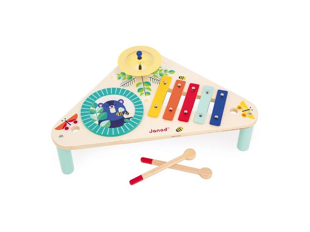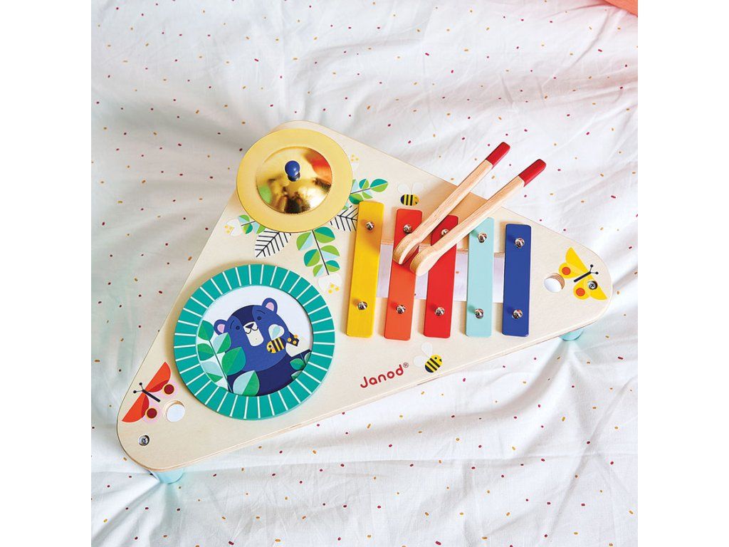 Drevený hudobný stolík Confetti Janod Nádherný farebný hudobný set pre malých hudobníkov.