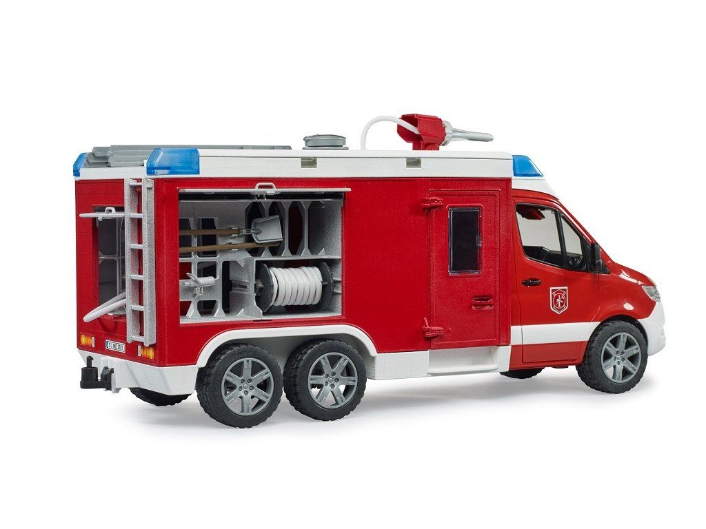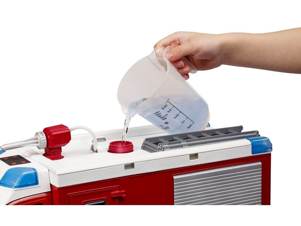 Integrovaná nádrž na vodu sa dá jednoducho naplniť a priložená hadica je navrhnutá tak, aby ju figúrky hasičov BRUDER mohli ľahko používať alebo pripevniť na košík rebríka s funkčnou tryskou.