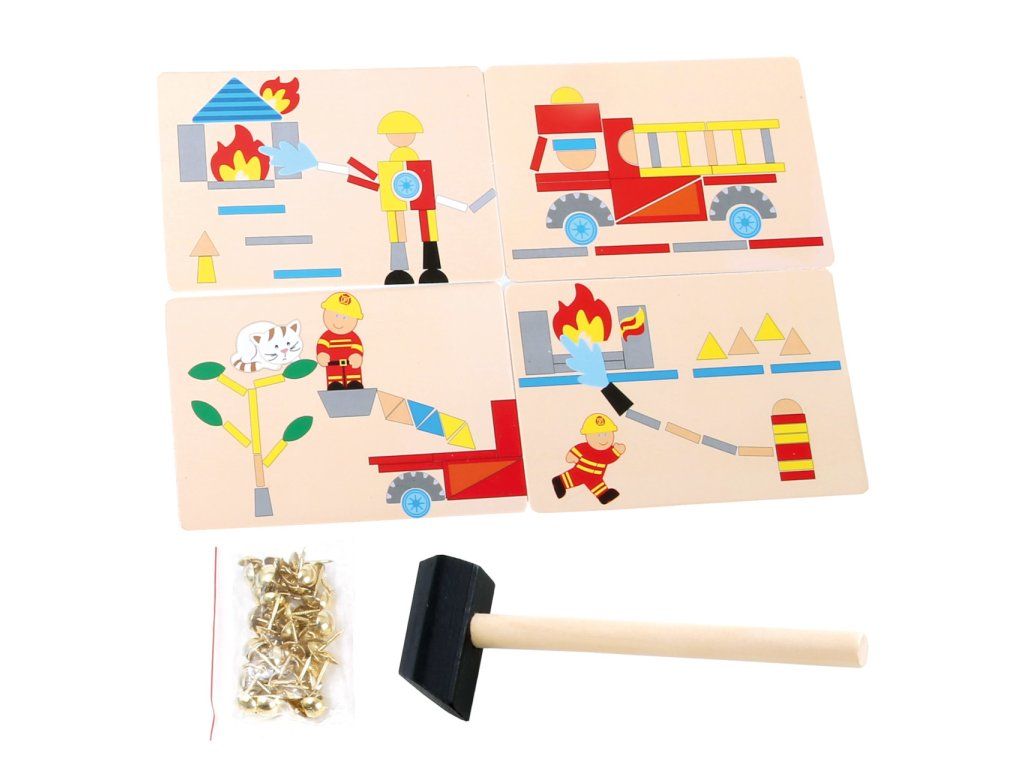 Z rozmanitých farebných dielikov môžu deti vytvárať rôzne motívy a pomocou kladivka a klinčekov ich upevňovať na korkovú podložku. Hotové obrázky je možné jednoducho opäť rozobrať a tvoriť nové.