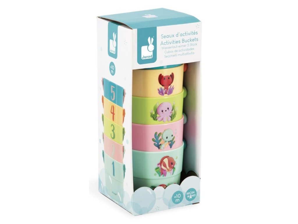 Objavujte mláďatká morských živočíchov! Sada 5 farebných vedierok robí kúpanie zábavnejším a podporuje objavovanie pre deti od 10 mesiacov.