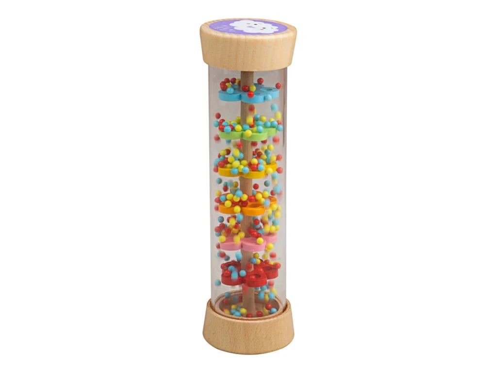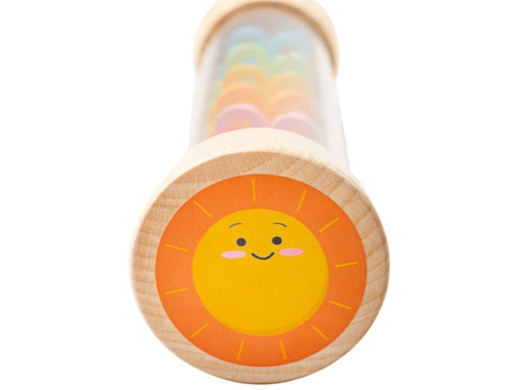 Roztomilá drevená hračka, ktorá vydáva zvuky dažďa. Pri otáčaní valcovitej hračky sa začnú pohybovať farebné korálky vo vnútri a vytvárajú zaujímavý vizuálny aj zvukový efekt. Na oboch stranách nájdete drevené zakončenia s krásnou ilustráciou slnka a oblaku. Vyrobené z kvalitných materiálov zo zodpovedných zdrojov. Spĺňa európske bezpečnostné normy.