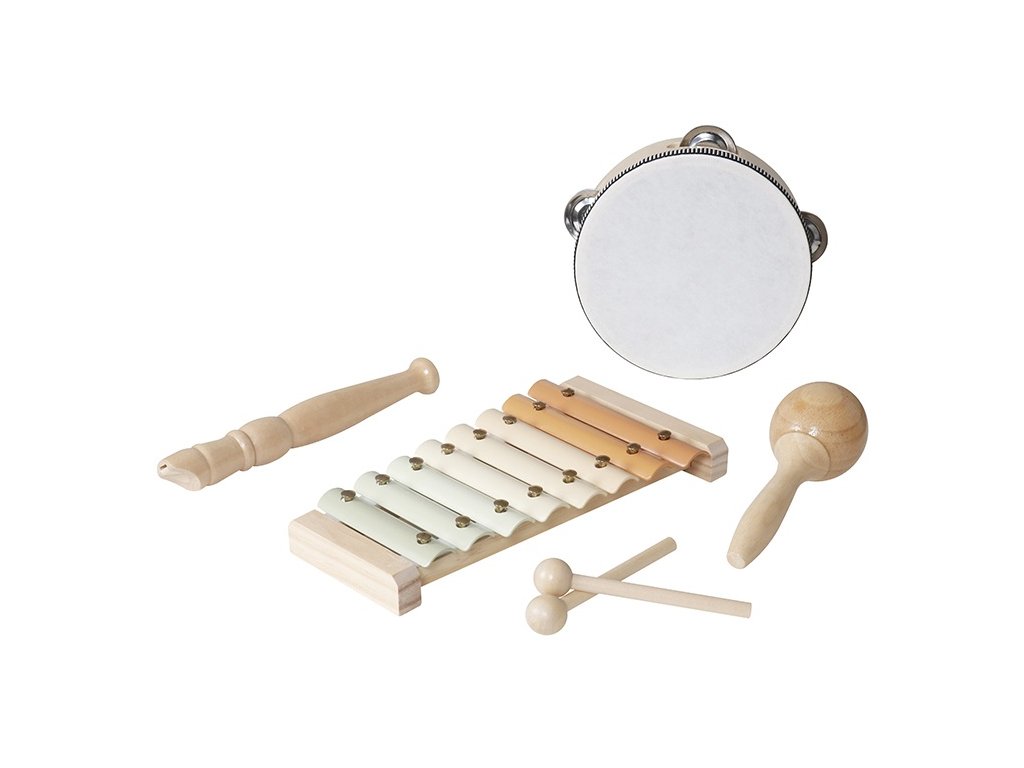 Sada obsahuje tamburínu, rumba guľu, flautu a xylofón, vďaka čomu ponúka pestrú škálu zvukov a jednoduchých melódií. Hračky sú vyrobené z kvalitného prírodného dreva doplneného jemnými pastelovými farbami.