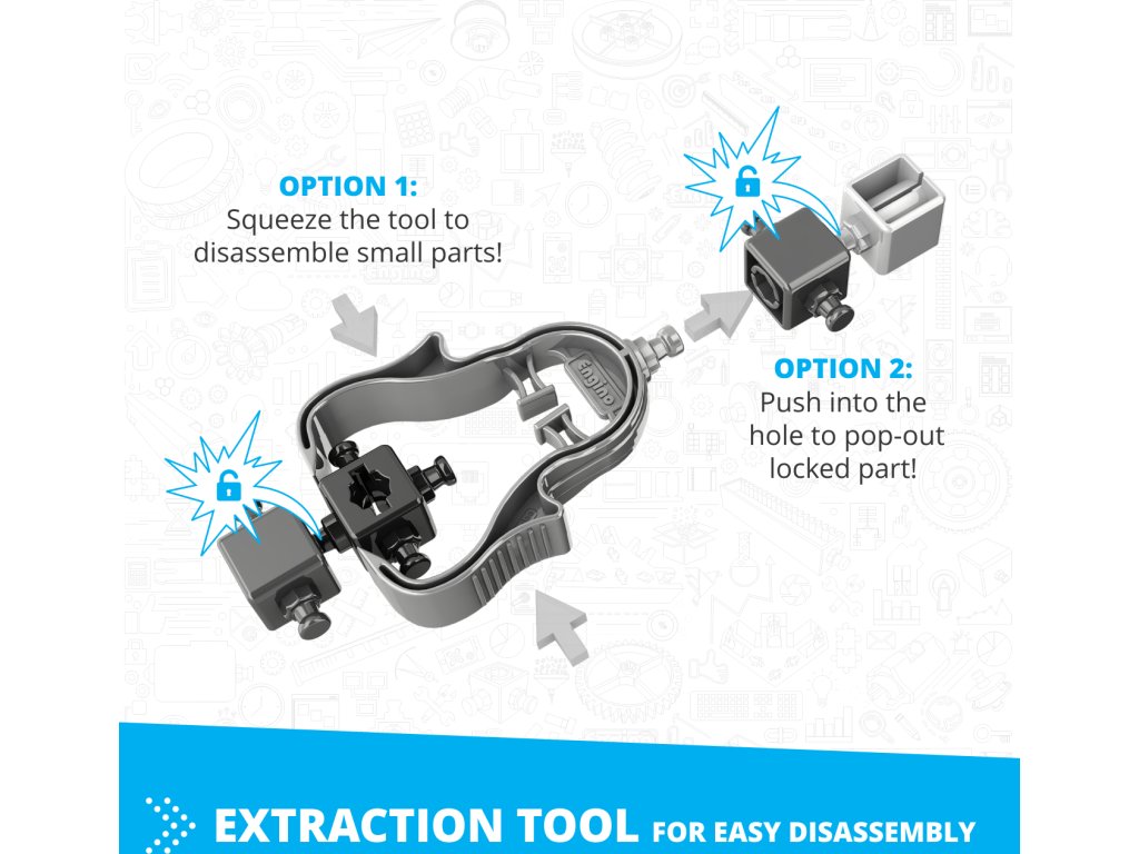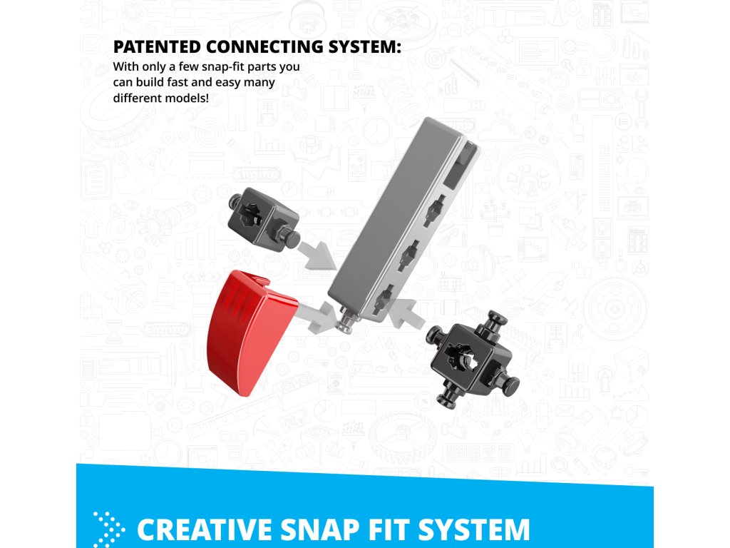 Systém ENGINO® využíva patentované komponenty, ktoré zvyšujú nielen funkčnosť, ale aj estetickú hodnotu modelov. Medzi tieto časti patria vysoko precízne kolesá, realistické mechanizmy a zaklapávacie zakrivené povrchy, vďaka ktorým je stavanie jednoduché, presné a zábavné.