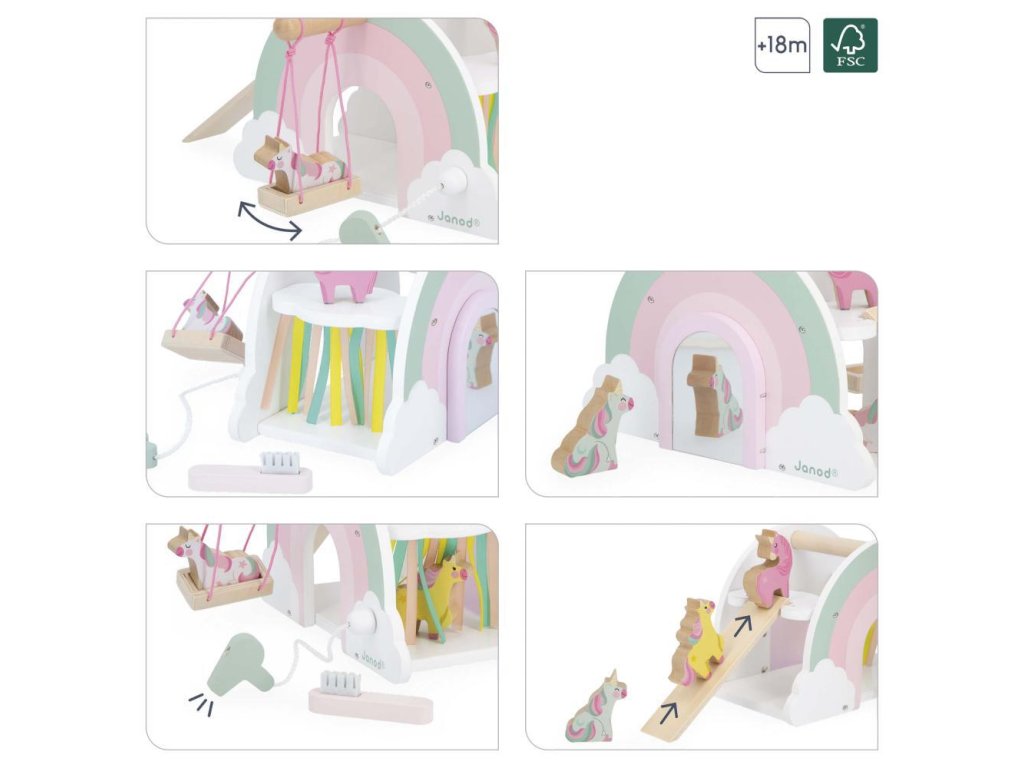 Vstúpte do očarujúceho domu jednorožcov! Hrajte sa so 4 jednorožcami a ich šmykľavkou, objavujte hojdačku a tajné prekvapenia. Vhodné pre deti od 18 mesiacov.