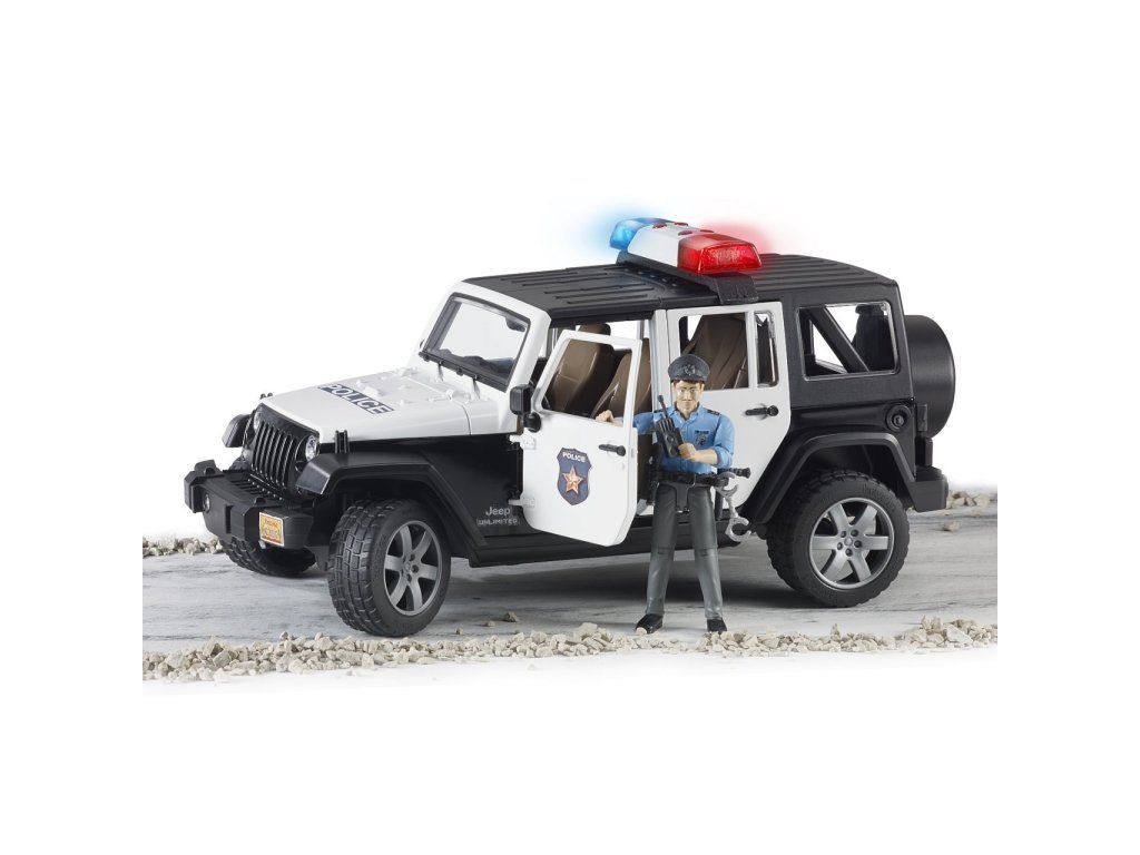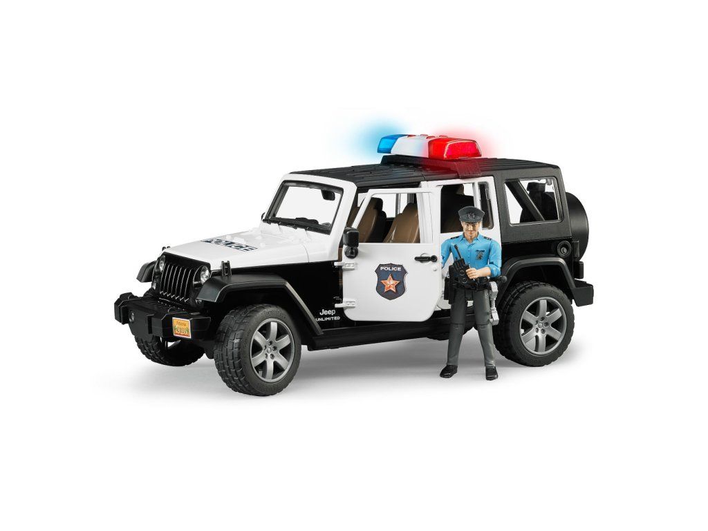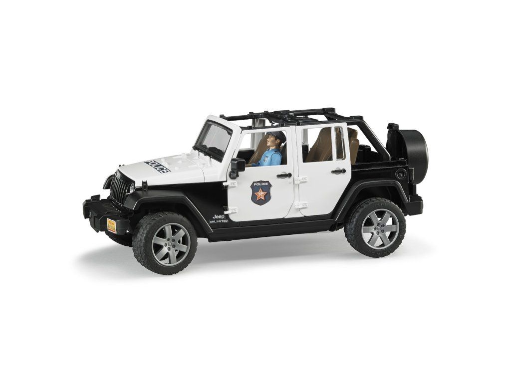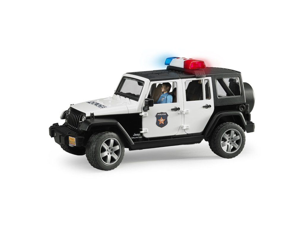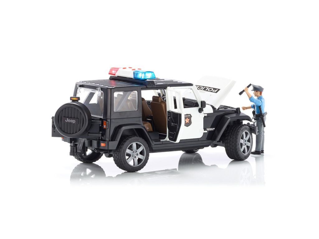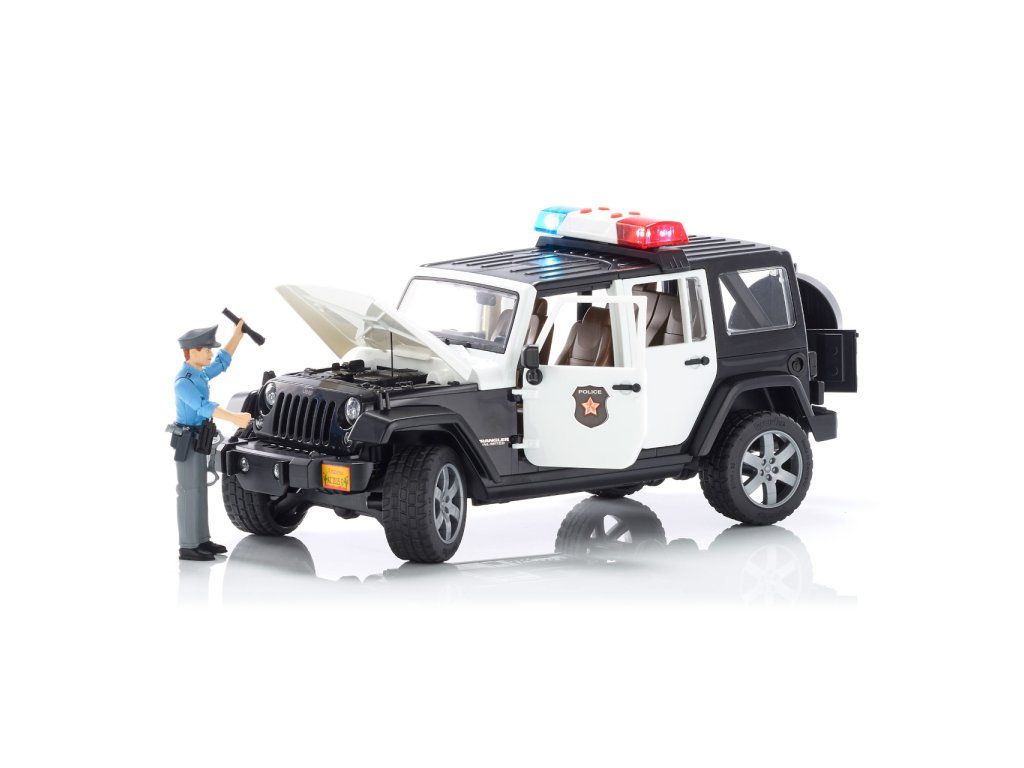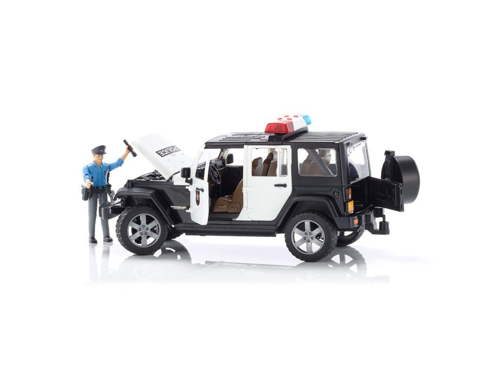 Bruder Jeep Wrangler Rubicon Polícia s figúrkou je detailne prepracovaný model, ktorý prináša realistický zážitok z policajných zásahov v teréne aj v meste.