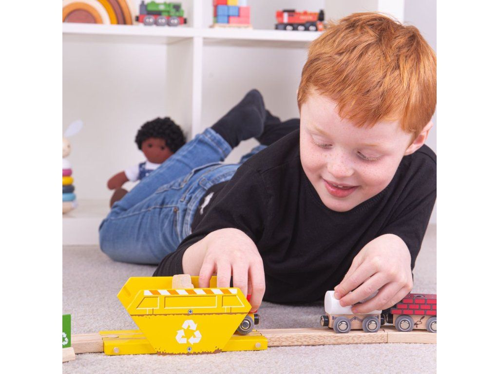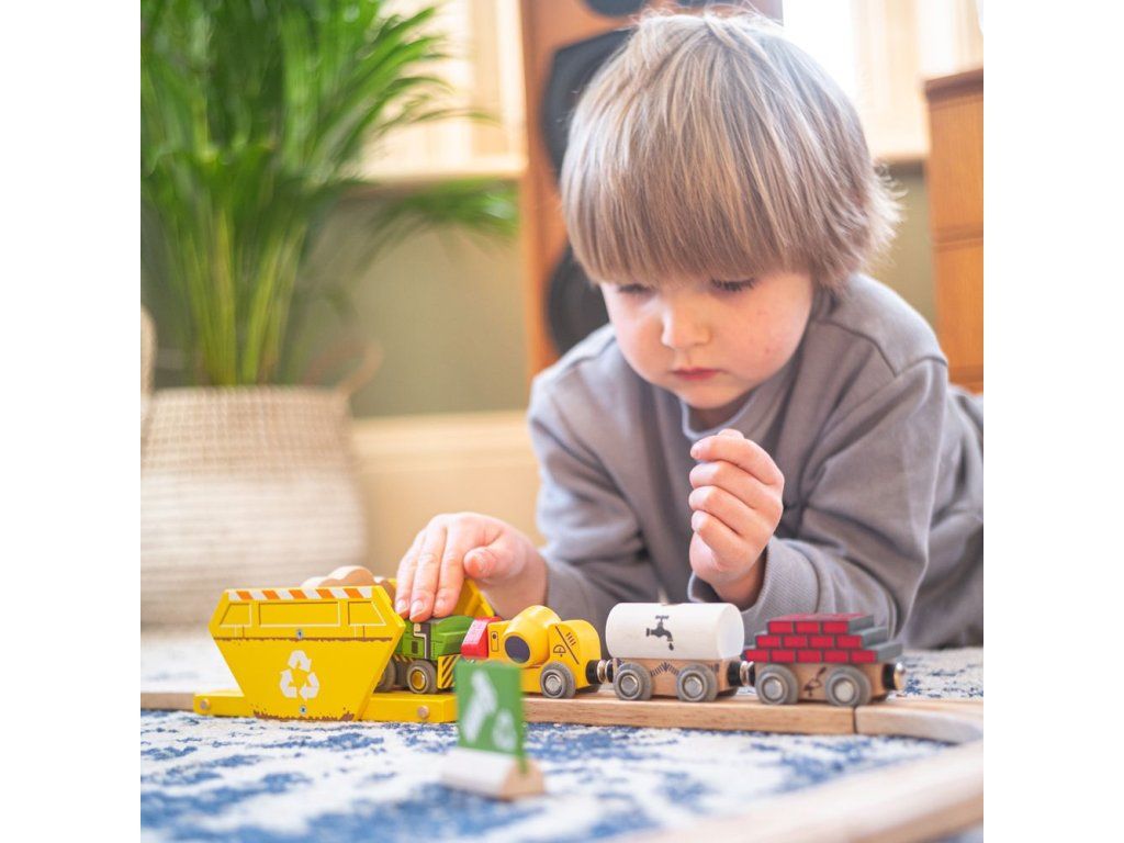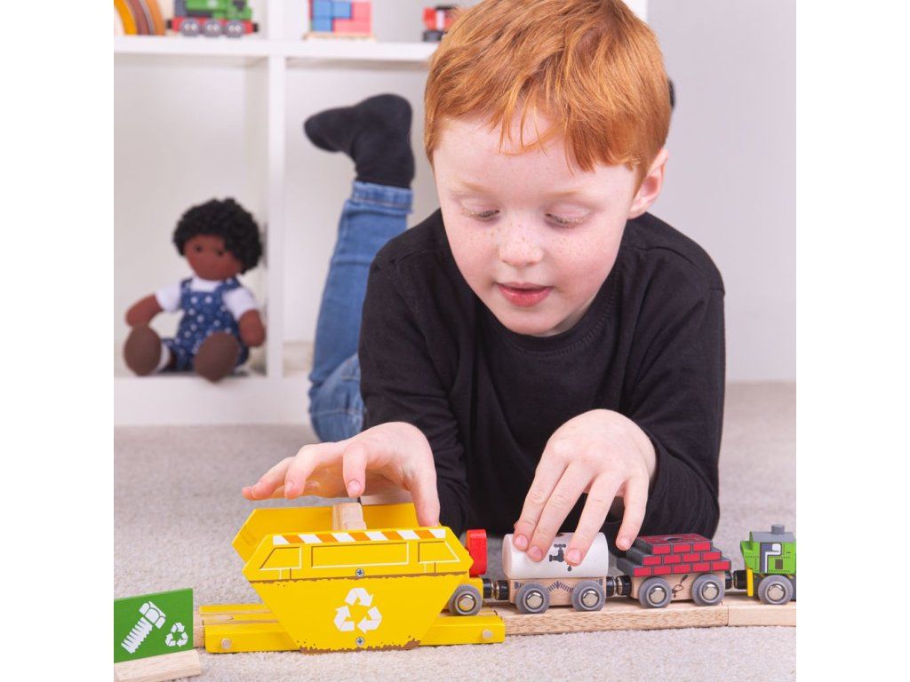 Tento pestrofarebný recyklačný kontajner je skvelým doplnkom k našej stavebnici. Kontajner je vybavený viečkom, aby mohol slúžiť ako koncový alebo počiatočný bod koľají. Kompletný s traťovou značkou. Ľahko sa pripojí k ďalšej drevenej dráhe a príslušenstvu.