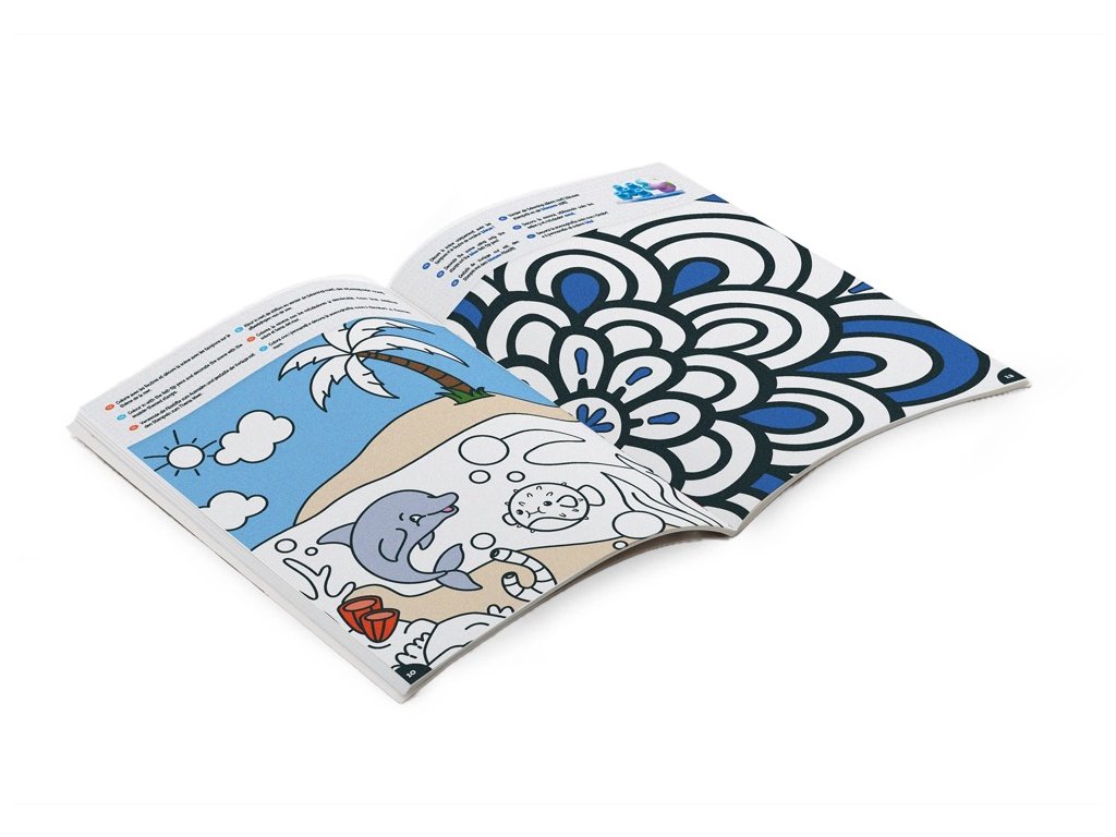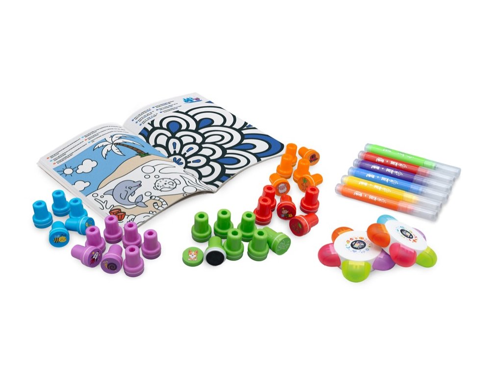 Vďaka 20-stranovému aktivitnému zošitu môžu deti pečiatkovať, vyfarbovať a vytvárať vlastné vzory na priložených dekoroch.