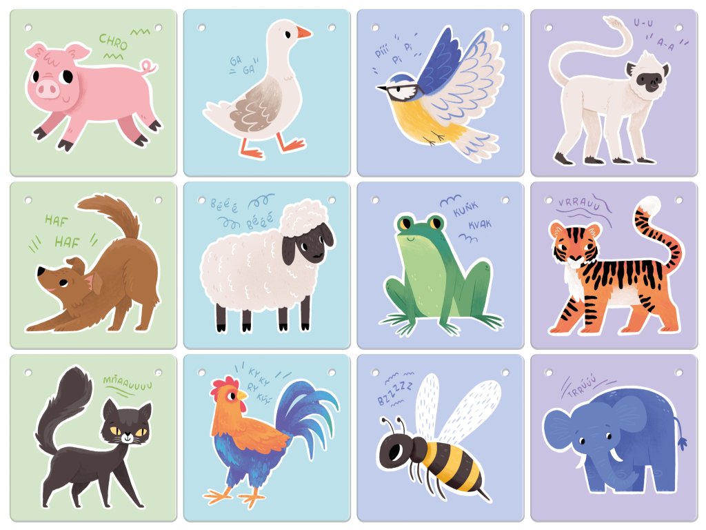 - 12 veľkých obojstranných kariet = 24 prehľadných obrázkov: 12 zvierat + 12 predmetov dennej potreby