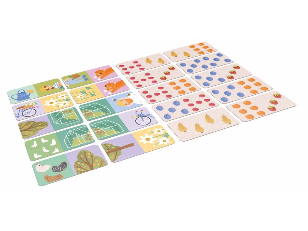 Lícová strana kartičiek prináša hravé motívy zvierat a záhradníkov s ich náradím, zatiaľ čo rubová strana s bodkami z rôznych druhov ovocia ponúka možnosť hry domino. Táto interaktívna hračka je vyrobená v Českej republike z kvalitného kartónu.