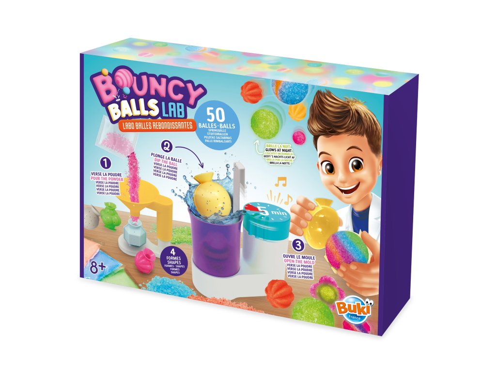 Vytvorte si vlastné skákacie loptičky všetkých farieb a tvarov priamo doma! Zábavné laboratórium s 3 stanicami umožňuje deťom vyrobiť až 50 originálnych loptičiek a pritom spoznávať jednoduché princípy tvorby materiálov hravou formou.