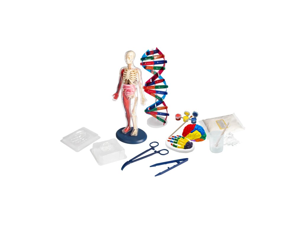 Rozšírené aktivity: V sade si môžete zostaviť model ľudskej DNA, odliať model ľudského mozgu a kostí ruky a pomaľovať ich podľa priloženého návodu. Sada podporuje jemnú motoriku, logické myslenie a zvedavosť.