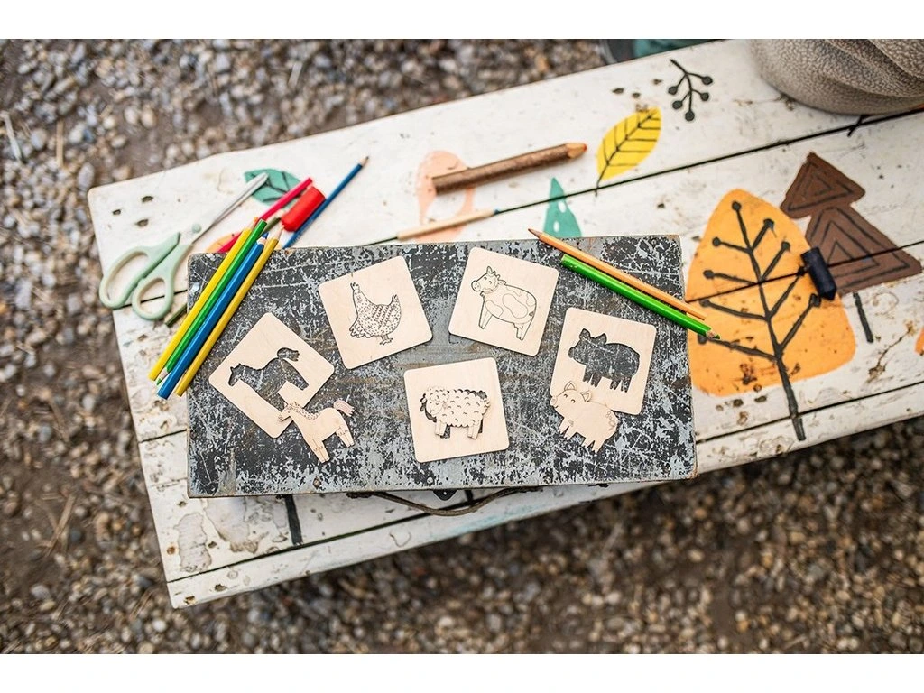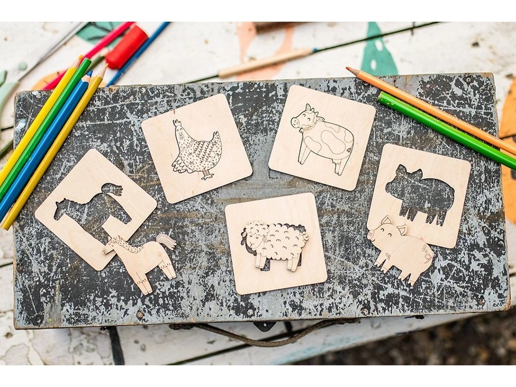 S touto unikátnou sadou s motívom zvierat na farme si deti užijú veľa zábavy. Deti ju môžu využiť ako vkladačku alebo puzzle, pohrávať sa s postavičkami zvierat, ktoré si navyše vymaľujú podľa svojej fantázie. Či už použijú pastelky, fixky, vodovky alebo samolepky, výsledkom bude vždy originálne umelecké dielo, na ktoré môžu byť právom hrdé. Možnosti sú neobmedzené! Tento drevený kreatívny set je ideálnym prostriedkom na rozvoj fantázie, jemnej motoriky a umeleckých zručností.