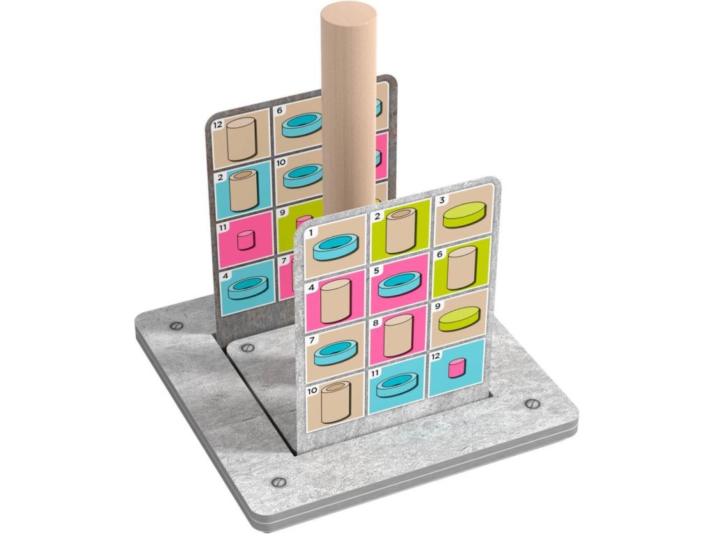 - 8 komponentov (2 zelené kotúče, ružový valec, hnedý sud a modrý krúžok)