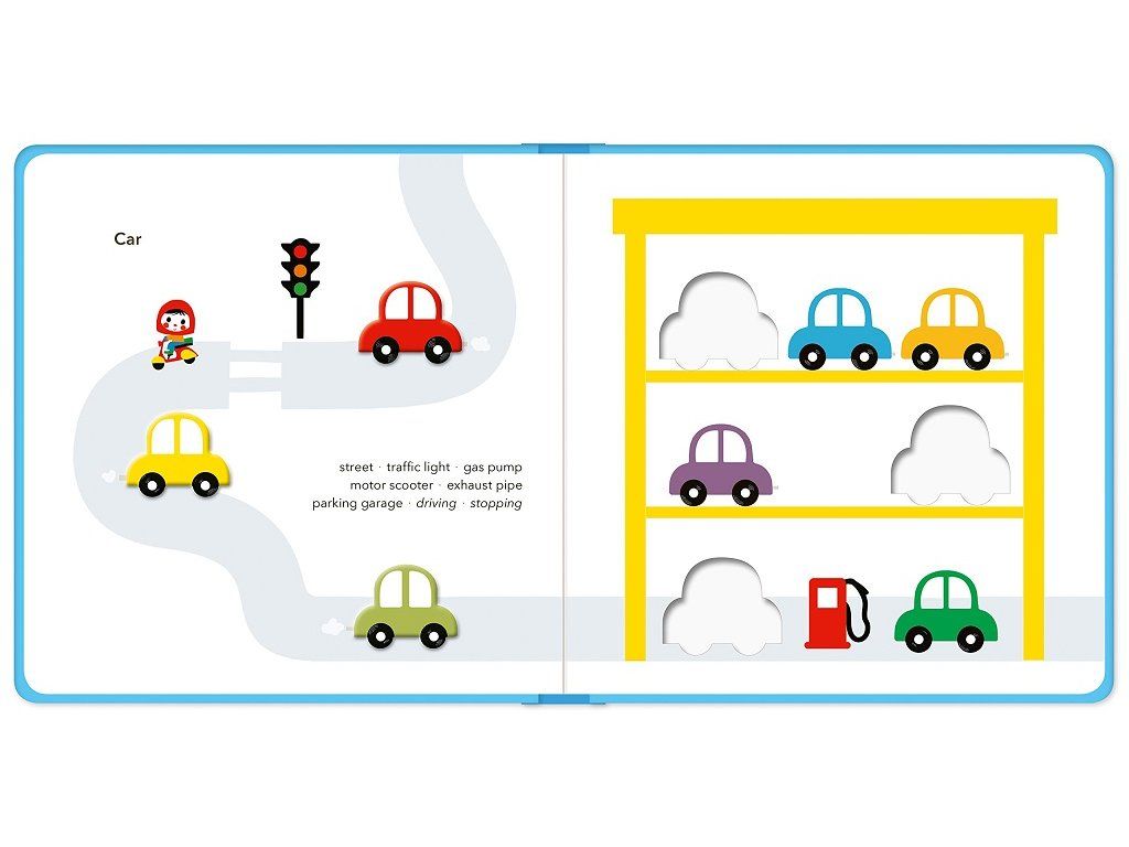 Sledujte vlak so zvýšeným železničným vozňom na jednej strane a vyhĺbeným tvarom koľaje na strane druhej. Jednoduché slová na klasickom bielom pozadí pomáhajú deťom lepšie porozumieť svetu pomocou zraku, sluchu a hmatu.