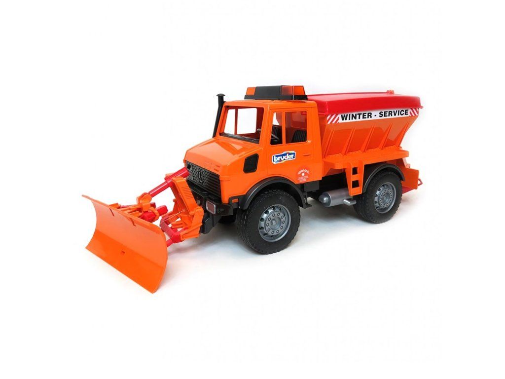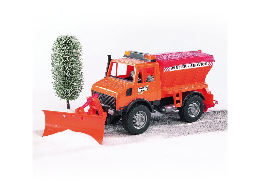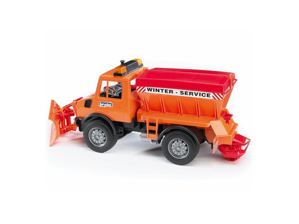 BRUDER 2572 – Mercedes Unimog pre zimné práce s radlicou a sypačom je vozidlo určené na boj proti prívalom snehu v zimnej údržbe ciest.