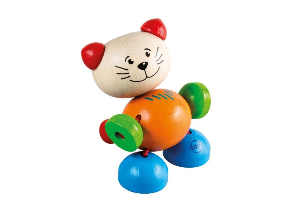 - farebná drevená mačička z pohyblivých tvarov na gume
